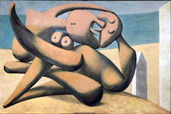 In the 1930s, during the Spanish Civil War, Picasso mingled with young Surrealist artists and became embroiled in complex love affairs. During this period, his art broke free from the rigid confinement of Classical forms and his canvases show dramatic changes. His portraits of Dora Maar, a surrealist photographer, are painted in what became his trademark distorted style in which, for example, two eyes could be found facing in different directions. Though he approached abstraction in this period, there was always a human element recognizable in these works — "Figures on the Sea Shore" (1931) at NACT shows two figures that are almost geometric forms, yet clearly are uninhibitedly desiring each other.