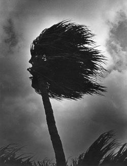 While some of the photographers, like Genichiro Kakegawa and Taira Koshichi, deal in gritty reportage, detailing the often harsh everyday lives of Okinawans, other photographers evoke the elemental beauty of the islands. With their strong shadows and skittery clouds, Shomei Tomatsu's "Pencil of the Sun" works capture the sultry heat of the Okinawan summer, while Yasuo Higa's "Kuba no Ki" (1975-77) from "Rituals of Kudaka Island" evokes a sense of wind-borne mystery.