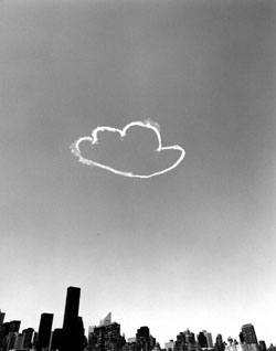 This attitude is most playfully seen in his "Picture of Clouds" series. In an ongoing project, Muniz photographs cartoon clouds that he has a plane skywrite over a city. The public is thus confronted with an icon of a cloud, but one that's actually suspended — like a real cloud — in the sky above them.