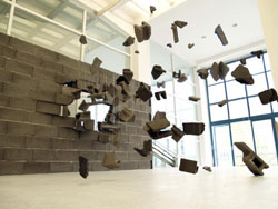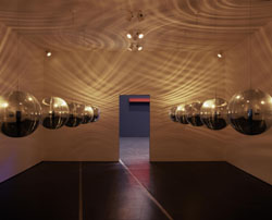 "Hein's piece is very simple," says Araki. "A metal ball rolls around by itself (on a floor with zig-zagging gold, white and black tape done by artist Jim Lambie). When the object is moving, the viewer's attention is instantly drawn to the object, and they react to it. If it rolls away, they follow, and if it comes nearer, they step back. So, instantly, dialogue and communication between the the object and the viewer starts.