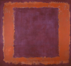 The Seagram works take up most of the space of the largest room in the museum and offer slight variations on the same motif. While earlier works often consisted of a rectangular block or two of color against a plain background, the solid blocks in the murals are more often rendered as an open box, or perhaps more accurately a frame. The areas inside the frames are usually the same color and tone as the background area, and, typically are painted in muted, somber tones of dark red, maroon and burgundy.