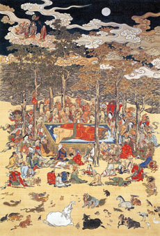 While her large-scale calligraphy shows a surprisingly masculine energy, her paintings combine delicate artistic technique with a sense of serene devotion. Her "Death of the Buddha" (18th century), shows the expiring deity surrounded by dozens of disciples and animals. The attention to worldly detail suffused with spiritual love in the picture strongly reminds us that the spiritual and material don't necessarily have to occupy different planes of reality.