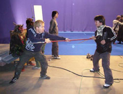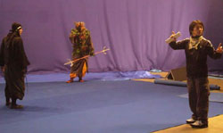 Taking his actors and stuntmen aside, Tanigaki tried out swordplay combinations with a casual speed, fluidity and concentration, like a chess master running through familiar openings while looking for interesting variations. Veteran stuntman Takahito Ouchi, who was playing Hoichi in action scenes, instantly followed Tanigaki's lead, while suggesting ideas of his own. Within five minutes, they had worked out and rehearsed a complex series of moves that Ouchi was soon performing flawlessly for the camera.