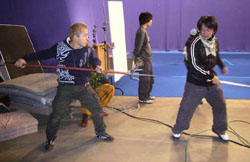 At the same time, Tanigaki wanted to make every scene as eye-catching as possible — thus the swirling, flashy sword moves from wushu (a Chinese martial art often seen in Hong Kong action films). "I don't really like the wushu style personally," he commented. "I like something more realistic, but for this film wushu works best."