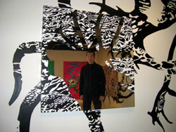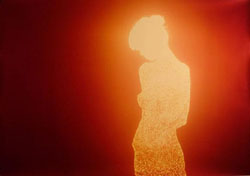The result is the artist's long-running "Guest" series. Bucklow takes giant sheets of tin foil, places photographic paper underneath them and then places both in the daylight before slowly poking holes in the foil to form life-size silhouettes of his subjects. It is like a large-scale camera obscura, and depending on which holes are punched first, the intensity of the exposure varies. The subjects are usually the artist's friends, who also represent different aspects of his own psyche. Recently, however, he was commissioned to create a portrait of German supermodel Claudia Schiffer for the November edition of the British Harper's Bazaar. Those works and others from his "Guest" series are now on show at the Emon Gallery in Tokyo's Hiroo.