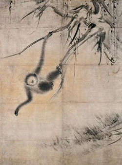 These colorful works contrast markedly with Hasegawa's equally excellent monochrome ink paintings. "Eight Views of the Xiao and Xiang Rivers" (undated) and "Landscape" (1599) are dominated by clear decisive strokes of the artist's brush; while "Pine Trees," a pair of six-fold screens, displays a softer, more smudged approach in presenting a wooded landscape delicately shrouded in mist. "Monkeys in a Withered Tree" (undated) combines both these forms of energy — employing powerful brushwork to create the branches, and fuzzy, softer, cross-hatched strokes to simulate the fur of what appear to be gibbons.