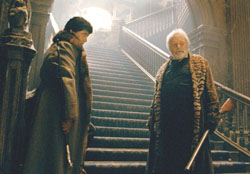 Hopkins plays Sir John Talbot, residing in a crumbling estate in the English countryside. Sir John is poor and mean but still majestic — lurching through his mansion in velvety robes, sprouting so much white facial hair you might think he habitually eats polar bears for breakfast. Del Toro is his estranged son Lawrence, who returns to his ancestral home after many years in America.