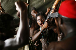 Fundamentally, the two films come from very different world views. "Titans" — like pretty much all Hollywood popcorn films — embraces the heroic quest, the journey of self-realization through combat and overcoming evil. "Johnny Mad Dog" is far more skeptical of the idea. One key scene shows the boys dancing and chanting around a campfire, part of an ancient initiation ritual for tribal warriors. Their foreheads are cut by witch doctors . . . who then rub cocaine into the wound. Bravery in a "magic" powder: so much for the myth of the noble warrior.
