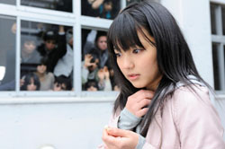 The reply comes when Ayumi is in class and the woman, looking like death warmed up, appears at the window and commences to bang her head against it. When the teacher comes to investigate, he soon regrets it — but not in time to save his life. Everyone flees in panic save the slow-on-the-uptake Ayumi and a classmate (Rikako Sakata), who fearlessly rescues her from the monster. Relief, however, is only temporary.