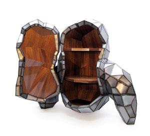 Ted Noten's jewelry includes gold-plated brooches cast from chewed pieces of gum, and various objects — from gem- encrusted rings to guns — encased in plexiglass and acrylic. Some are wearable, others amusingly impractical. Maarten Baas uses second-hand furniture, which he burned and then preserved with an epoxy resin for his "Smoke" collection. His other pieces, all of which look like they could have been pulled off of a Tim Burton film set, vary from hand-modeled clay tables and chairs to a grandfather clock that involves a video of a man drawing the time with a magic marker.