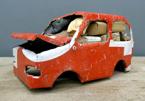 Right at the entrance of the exhibition space, miniature farming tools made of decayed wood and metal were unassumingly hung on the wall. On another wall, small paintings on tin plates, which compositionally use unpainted spaces in a similar way to Cezanne, give us a lyrical impression. The allegorical "My Vehicle (Daughter)" — a red tinplate miniature car, displayed on a pedestal and loaded with small boxes containing stones, wood and seeds — is a poignant piece that beautifully leaves its interpretation to the viewer's imagination.