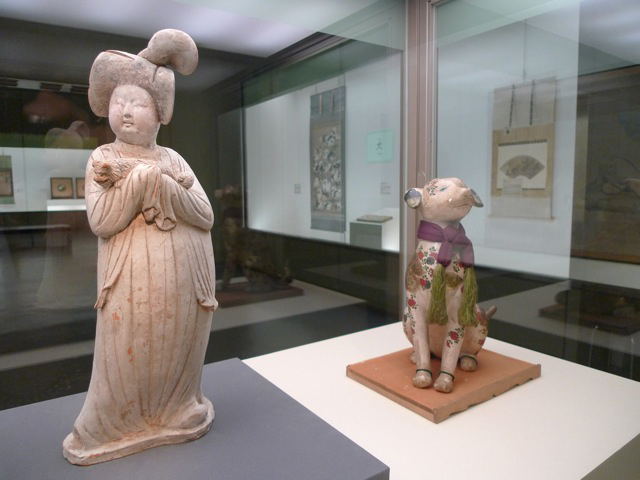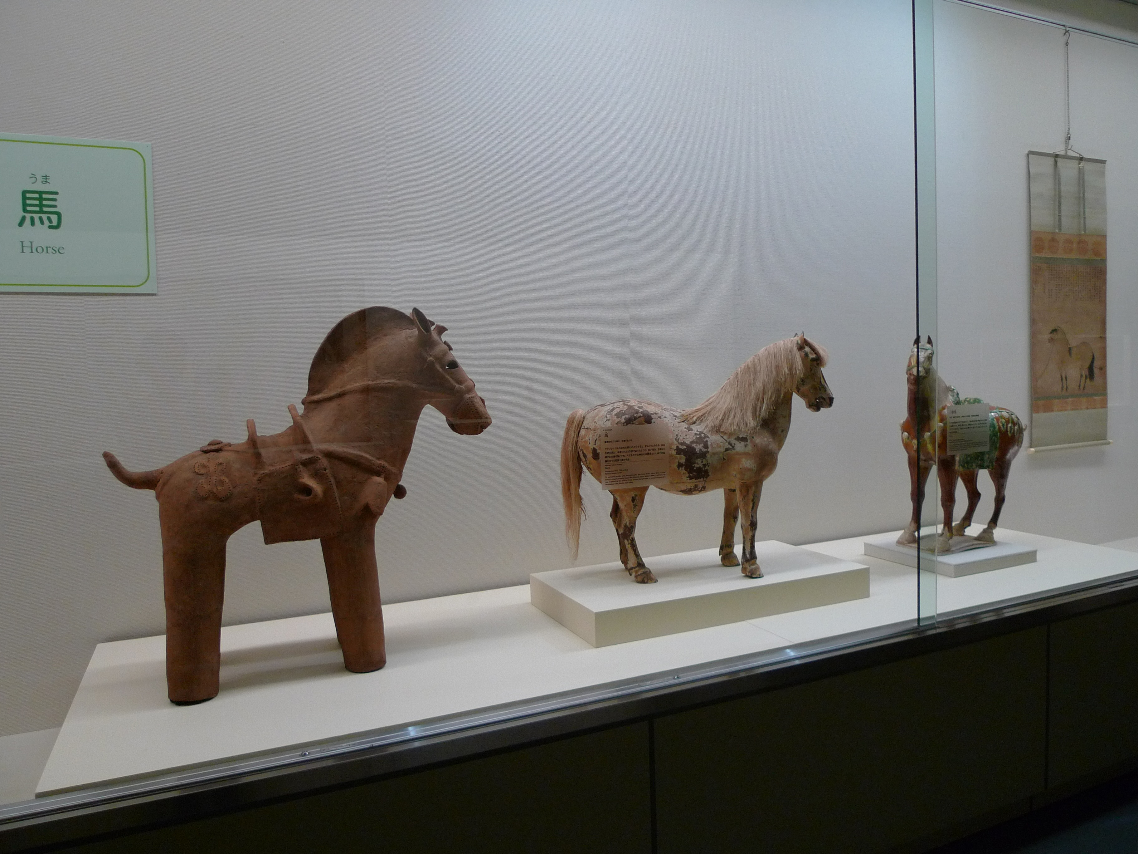 There is an interesting corner of this exhibition in which three types of horse figures are juxtaposed: a clay haniwa (sixth century), a 13th-century wooden sculpture and a three-color glazed stoneware piece from eighth-century China. Though stout and stocky when compared with the thoroughbreds of today, these depictions of horses are likely typical of local breeds in Japan at that time.