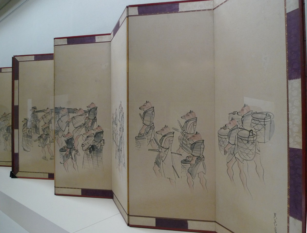 Foxes and raccoon dogs are common characters in old tales or allegories. It was believed that animals have emotions and behave just like human beings, and that sometimes, their ability exceeds human understanding. Such personification of animals is visible in many art forms, such as on scrolls and screens.