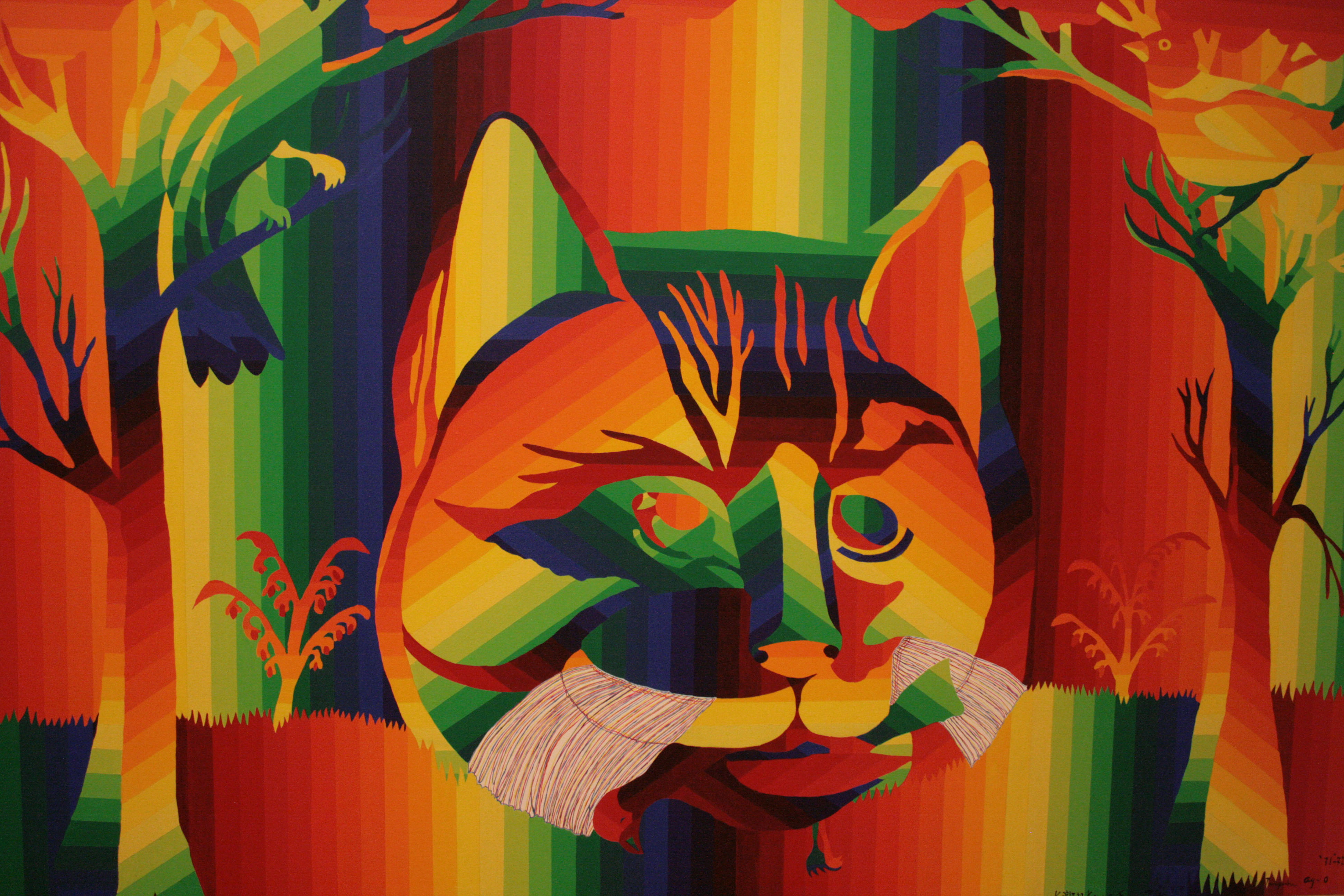 The exhibition of Ay-O's work, by contrast, is a visual delight. He is popularly known as "The Rainbow Man" because he typically colors his pieces by working through the entire spectrum, sometimes using as many as 192 gradations. But he is just as much an anti-artist, if not more so, than Tanaka.