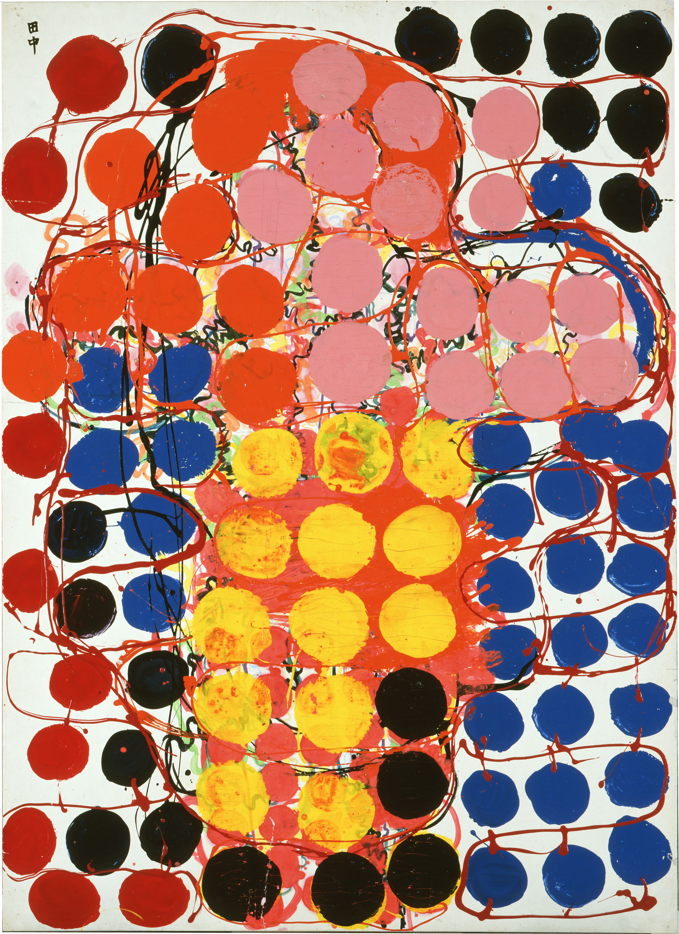 The rest of the exhibition, and indeed Tanaka's subsequent career, follows on from this work. The plan of the dress's circuitry apparently mesmerized her to the extent that she started to create sketches depicting it. These later evolved into paintings of colored dots interlinked by lines, which then became paintings of large concentric circles, some of them not without aesthetic impact. However, the image we get of the artist is not one of the mercurial innovativeness we associate with the avant-garde, but of an almost organic process lacking all ambition.