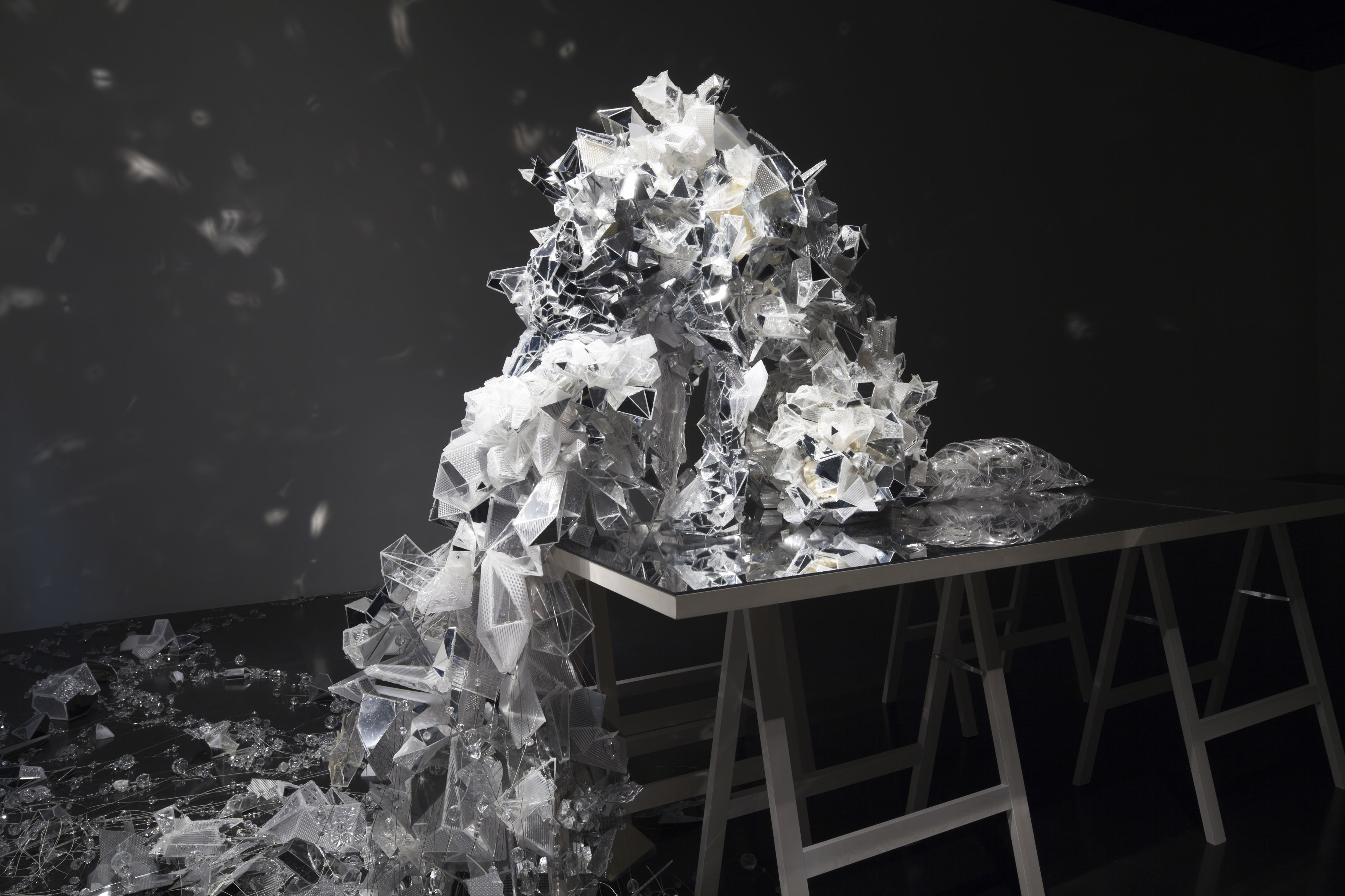 More than 50 maquettes were made before "The Secret Sharer" (2012), the final work in the exhibition, was completed. Modelled on the artist's dog, this larger-than-life dog-shaped sculpture sits atop a table, its mouth open wide as it vomits. Constructed from crystals and mirrors, the effect of this rather powerful, potentially off-putting image, is countered by the beauty of the materials. Not only does "The Secret Sharer" aim to tell the audience something by opening its mouth, but the mirrors also allow the viewers to share glimpses of themselves as well as the sculpture's surroundings.