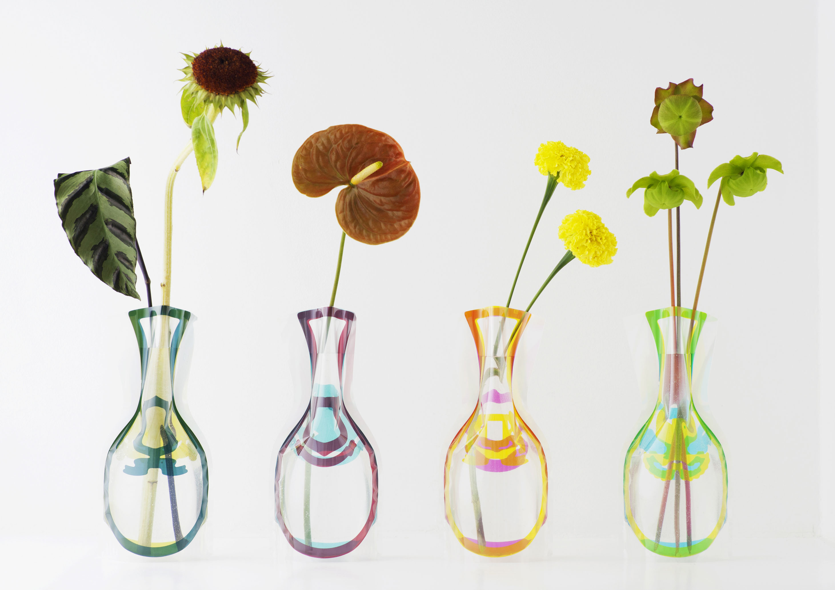 "The mechanism of the vase is the same as a shampoo refill pack," explained Uehara, referring to the plastic packs that stand up when they are full of liquid and can be squashed flat when empty.