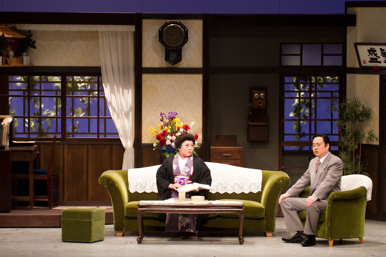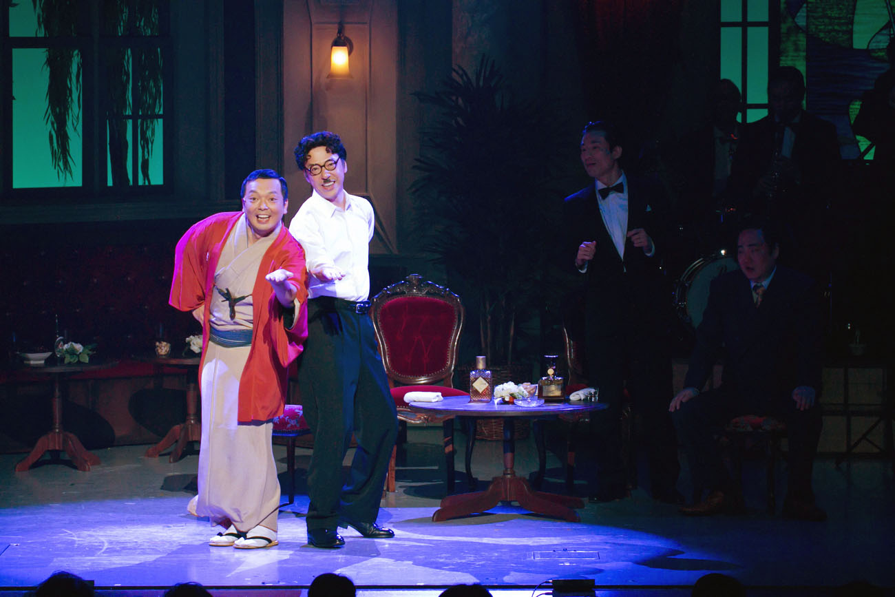 The play, penned by TV scriptwriter Chikako Osagawa, kicks off one evening in 1929, as the general manager of Yoshimoto Kogyo, Shonosuke Hayashi, entertains comedians from his stable at an Osaka jazz bar. (Hayashi assumed control of the company that his sister, Sei, and her husband, Yoshibe Yoshimoto, started in 1912 — events that were depicted in the first of the series of plays, which was staged in April.) The guests include Achako (played by comedian Reiji Nakagawa) and other successful practitioners of the "old" form of manzai, which combined singing, dancing and storytelling and was performed in traditional Japanese clothing.