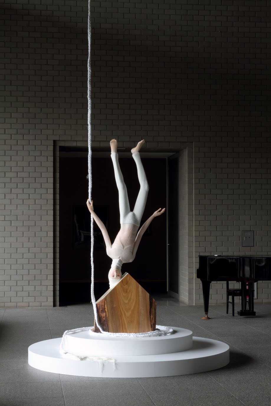 Other aspects of the exhibition dictated by Tanada are having one all-white room and one all-black room, and of course, the exact placement of the sculptures in each. The white room is dominated by "Nagi" (2011) and "Nami" (2011), a pair of figures — male and female — aligned horizontally and suspended a short distance from the floor, almost as if they are suicides jumping from a great height and frozen at the instant before they hit the ground, an impression that adds poignancy to their beauty.