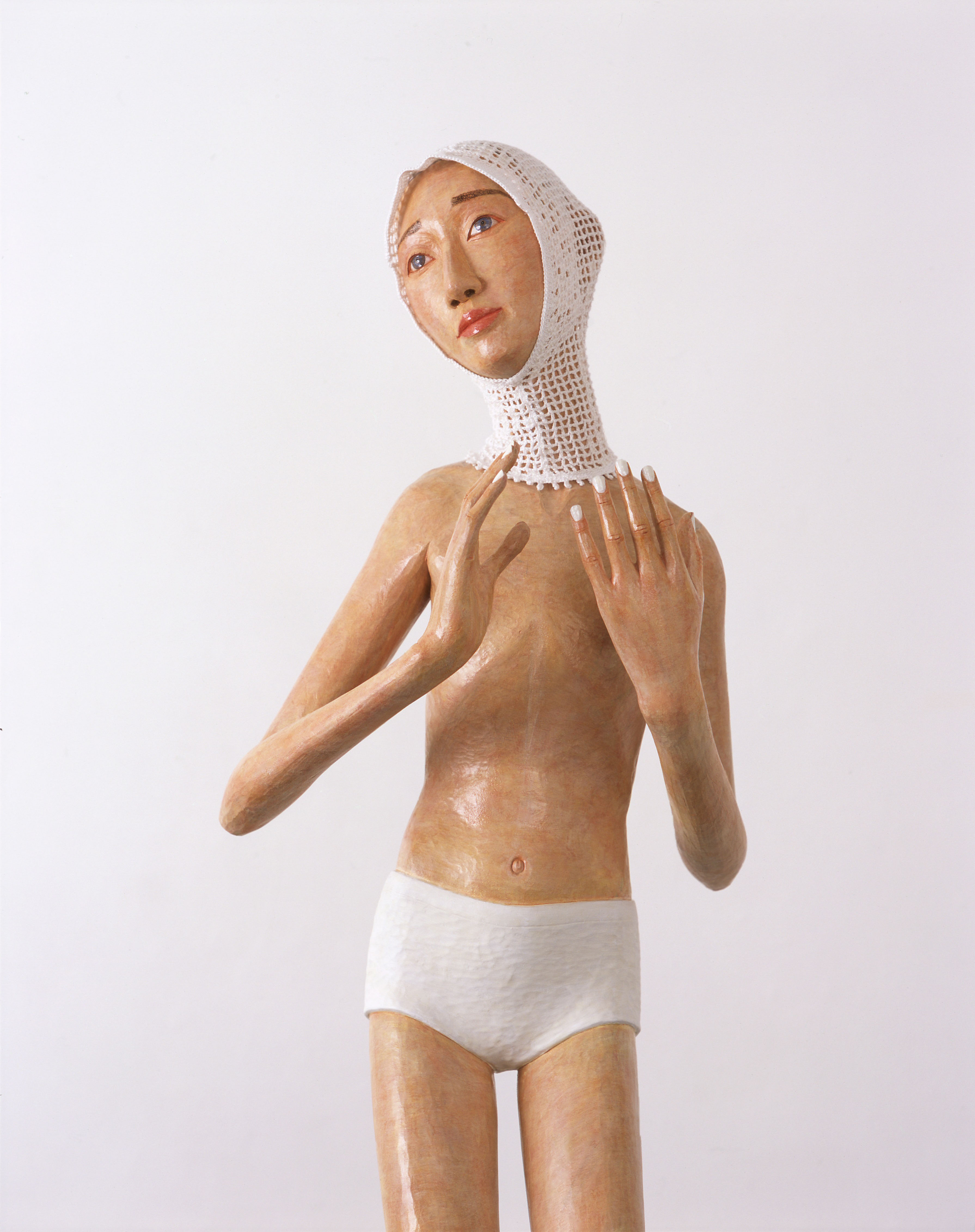 A powerful presence in the black room is "springing up boy" (2011), a figure that I couldn't help perceiving as Christ without a cross. This also highlights the most important influence on Tanada, seven months he spent in Germany in 2001, and the tradition of German woodcarving. In particular, the artist says he was struck by the asexual realism of a statue of Christ by the Late Gothic sculptor Tilman Riemenschneider (c.1460-1531). This is clearly something that has fed through into his highly androgynous figures with their sense of spiritual detachment from the world.