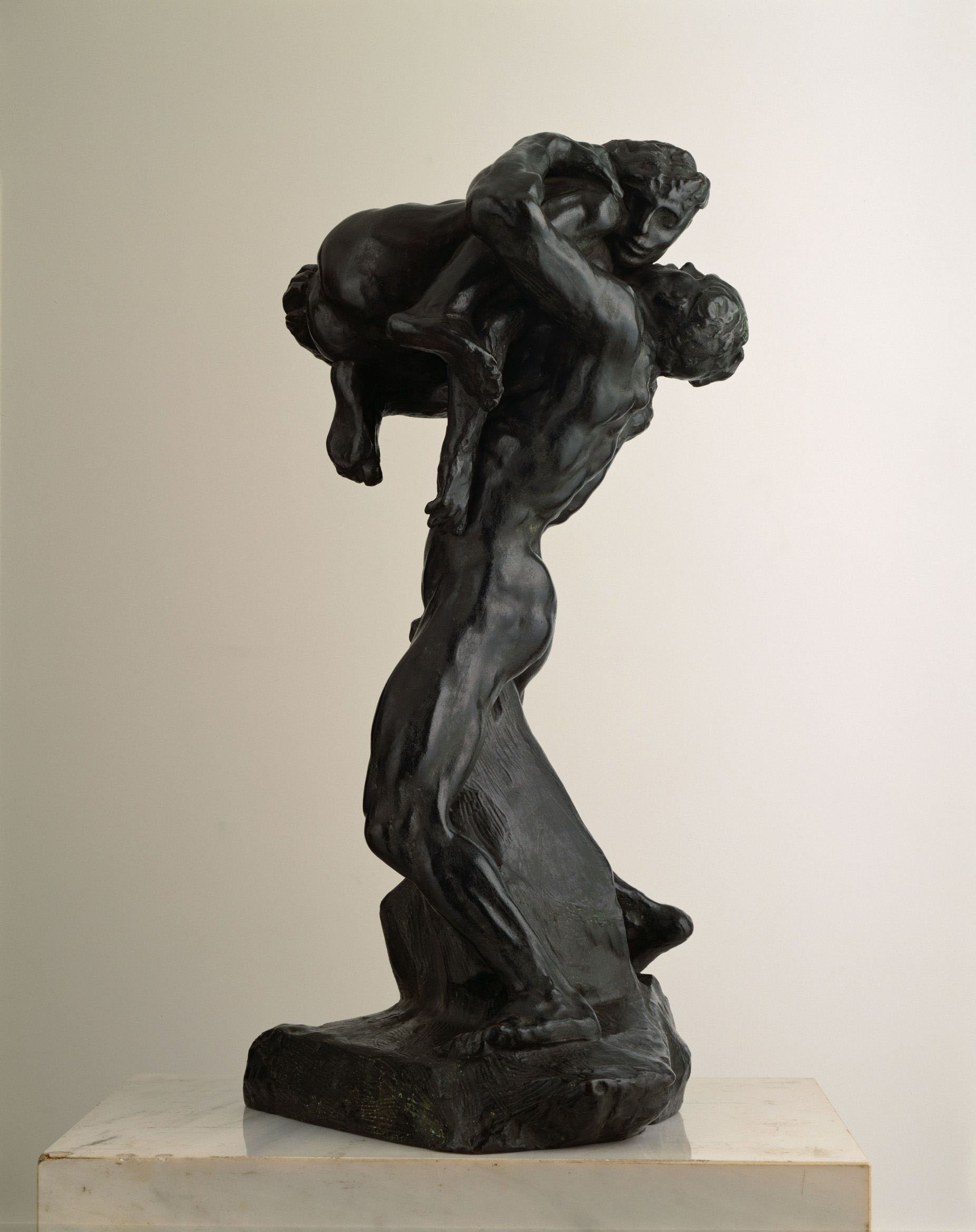 Rodin's "I am Beautiful" presents a muscular male figure showing his full strength by lifting a woman above his shoulders. At the same time, for some unaccountable reason, perhaps intense affection, he also folds her with his muscular arms into a dense ball.
