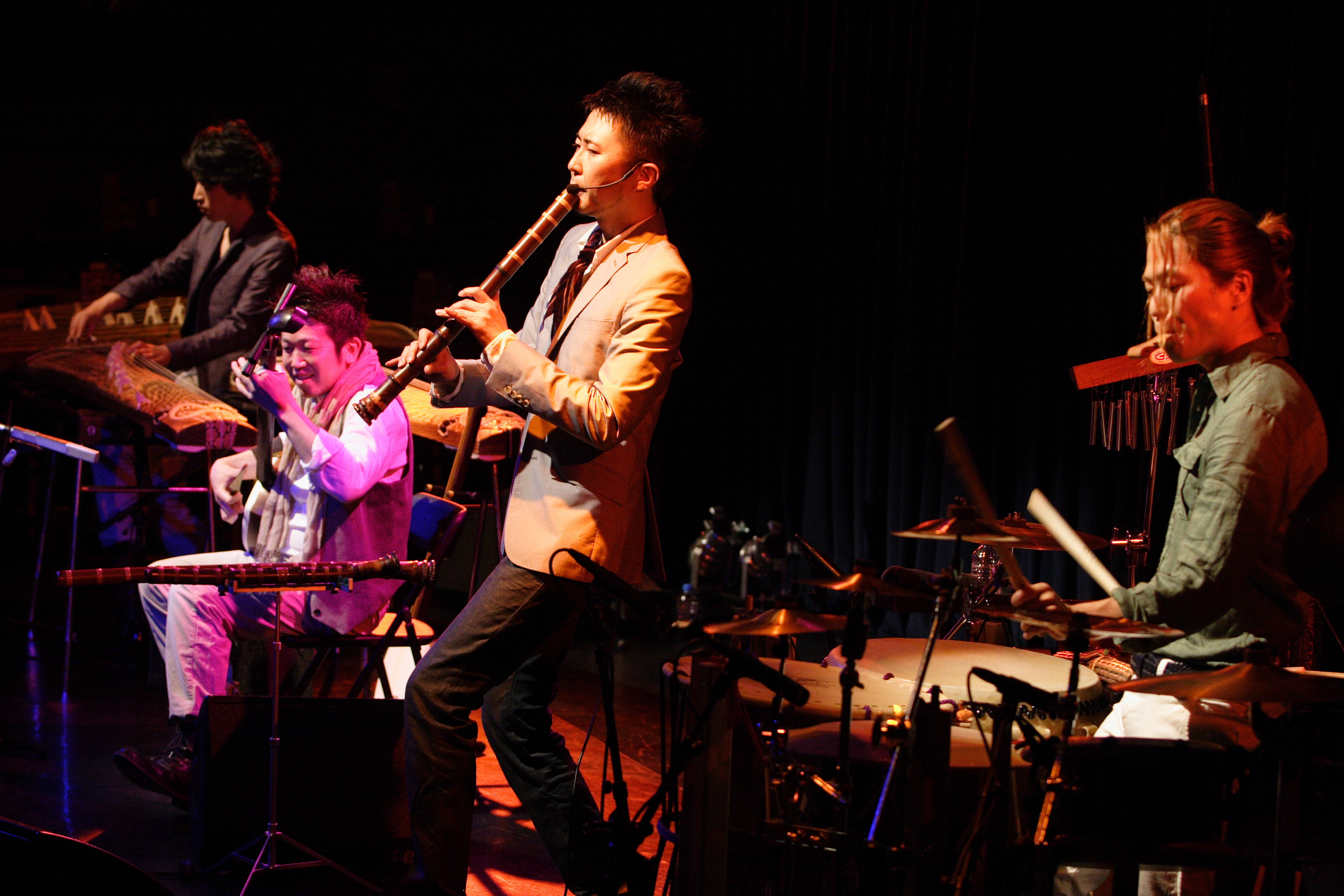Rounding out the quartet, percussionist Bihou comes from a family of taiko drummers as his grandfather founded the Bihou School of taiko. Bihou says that his drumming is different from wadaiko, big drums that are played by themselves without accompanying instrumentation. His approach to the taiko is similar to its traditional relationship with minyo (folk songs) and one that has also been used in kabuki theater.