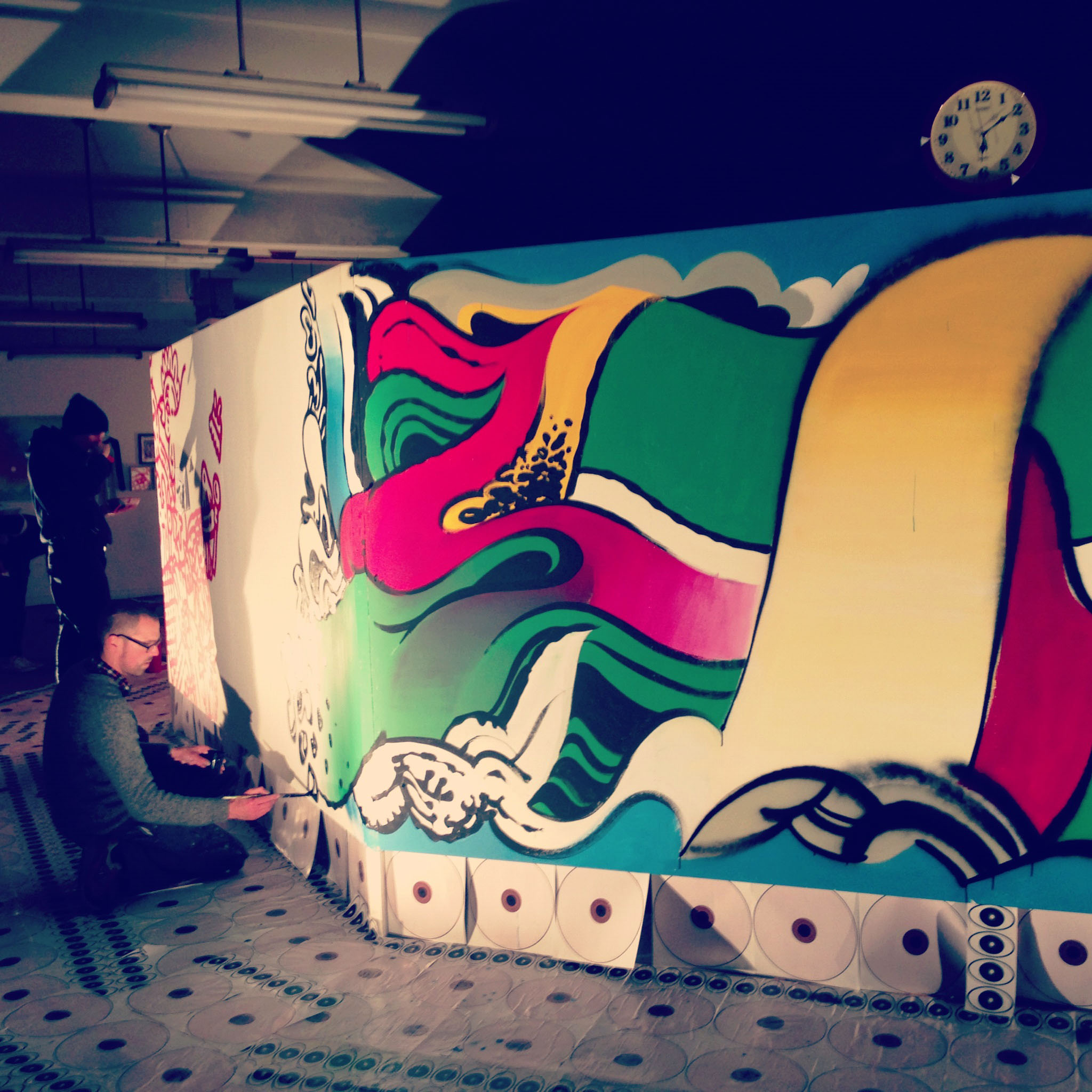 Upon arrival, several things are soon worth noting. Admission is free, drinks are free, and there are Dutch artists painting alongside their Japanese peers on a 360-degree indoor wall. Pika, from the bands Afrirampo and Acid Mothers Temple, is drumming noisily in an adjacent room. Performance artist Taniuchi Ikko is pouring paint all over himself, and DJs are spinning mellow tunes in the main room. The event is an impressive testament to the diversity of the city's creative palate.