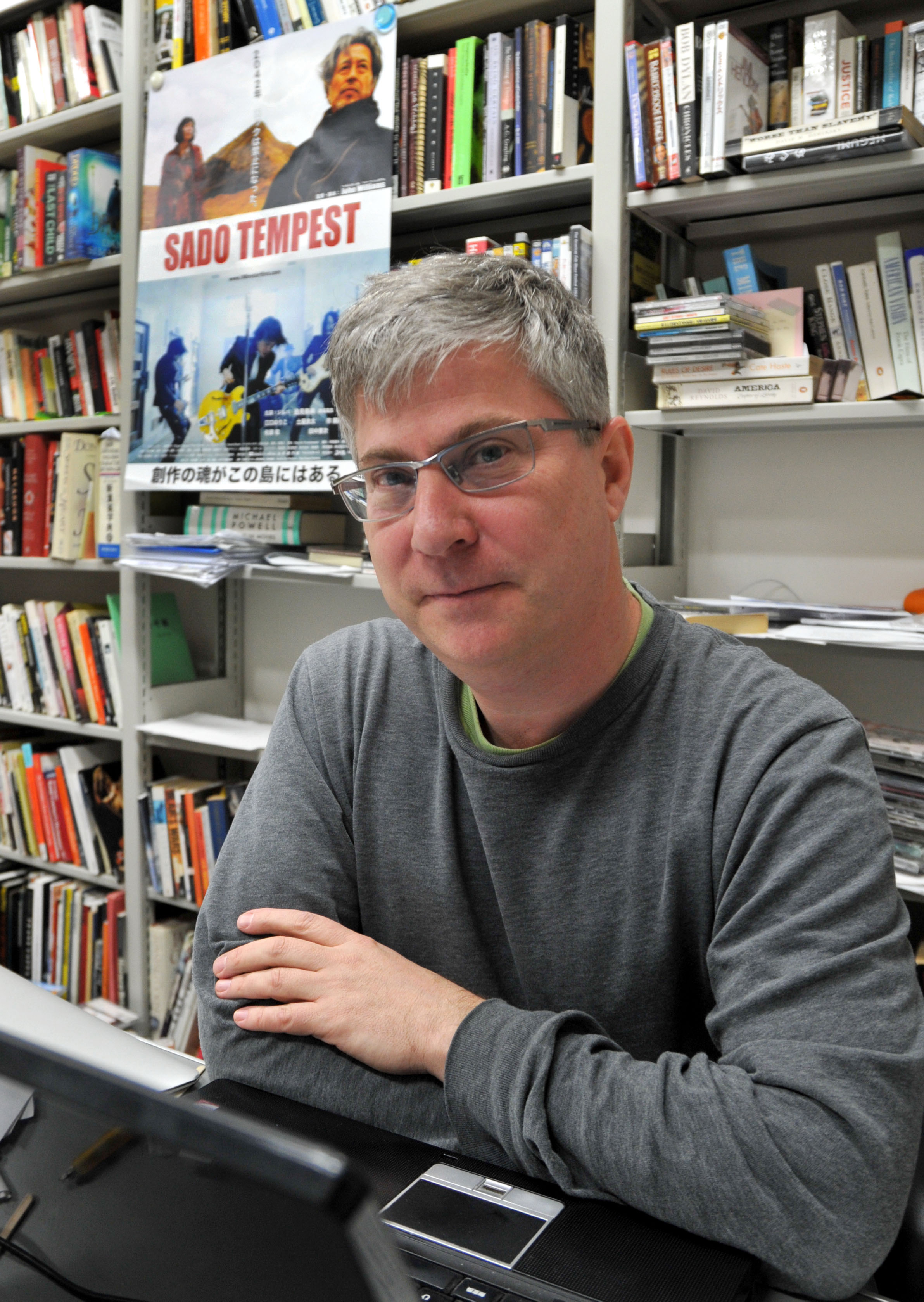 Instead he was fascinated by an abandoned temple falling into ruins. "It was beautiful, absolutely beautiful," he enthuses in an interview in his office at Sophia University, where he teaches film and translation. Williams began mentally flashing "horror movie," but after touring a mysterious primeval forest on Sado, he thought of William Shakespeare's play "The Tempest," "because it was a magical forest, a magical island," he explains. Then, on the way back to the mainland on the ferry, he had an image of a rock musician exiled to Sado in the present day: "It just came to me, I just saw it, a policeman taking this rock musician to the island, ha ha, and the musician is called Juntoku."