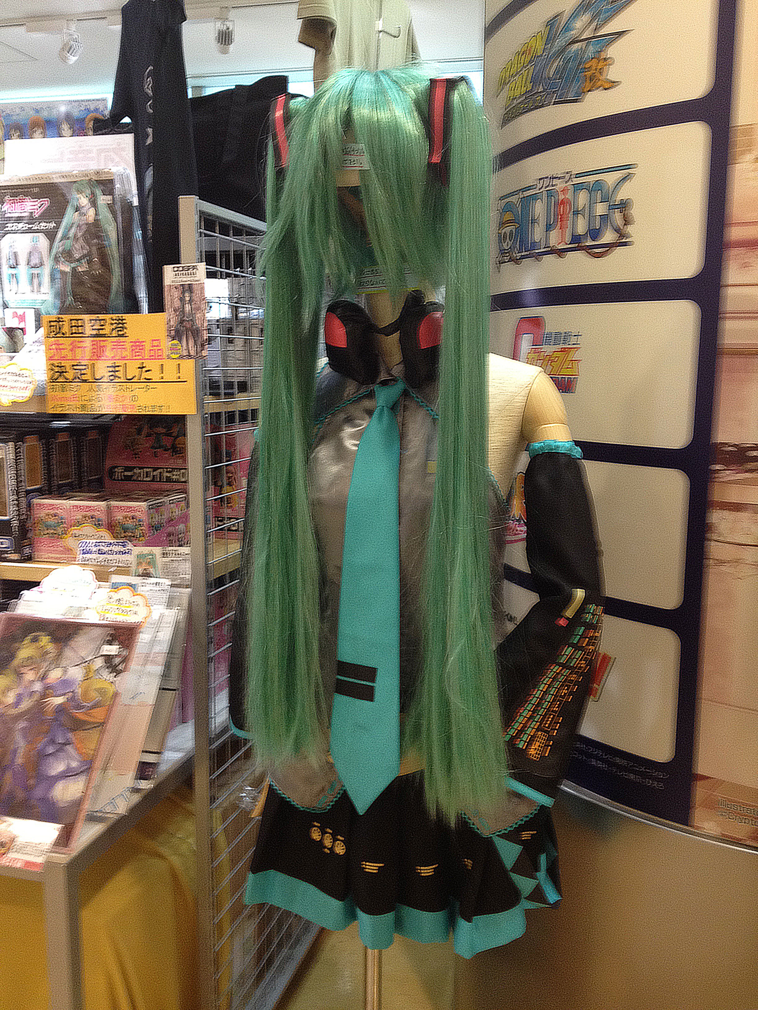 It turns out Miku is part of an expansive display in the new airport outlet of Cospa Akihabara, a shop devoted to Japanese pop culture products for global otaku (geeks)and cosplayers. The Narita venue opened in February and had a lively crowd of consumers at its counters when I stalled next to Miku last month, gingerly fingering my wallet.