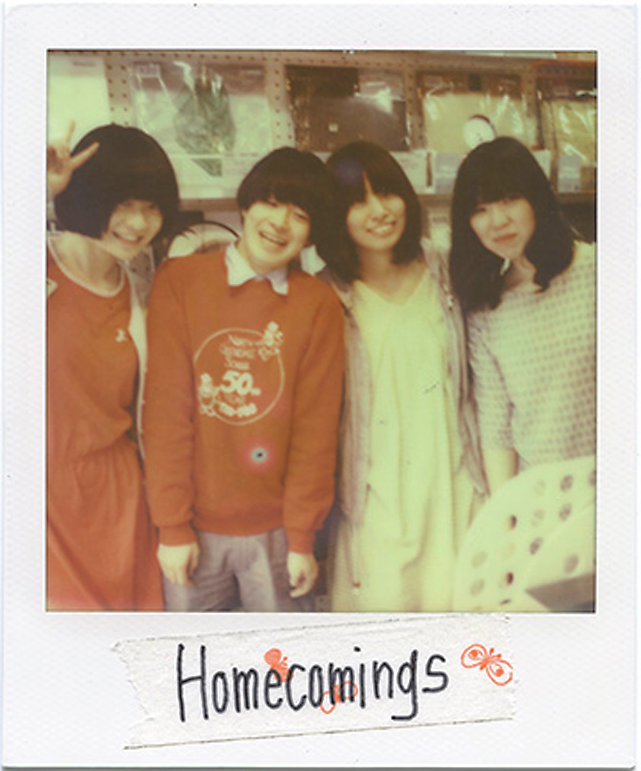 “Homecoming With Me?” is in stores now. Homecomings play Nano in Kyoto on July 15 (3:30 p.m. start; ¥1,500 in advance; 075-254-1930); and Shindaita Fever in Setagaya-ku, Tokyo, on Aug. 4 (6:30 p.m. start; ¥2,000 in advance; 03-6304-7899). The “Homecoming With Me?” release tour starts at K.D. Japon in Nagoya (6:30 p.m. doors open; ¥2,000 in advance; 052-251-0324). The band will also play Fuji Rock Festival's Rookie A Go-Go stage on July 27. For more information, visit www.homecomings.jp