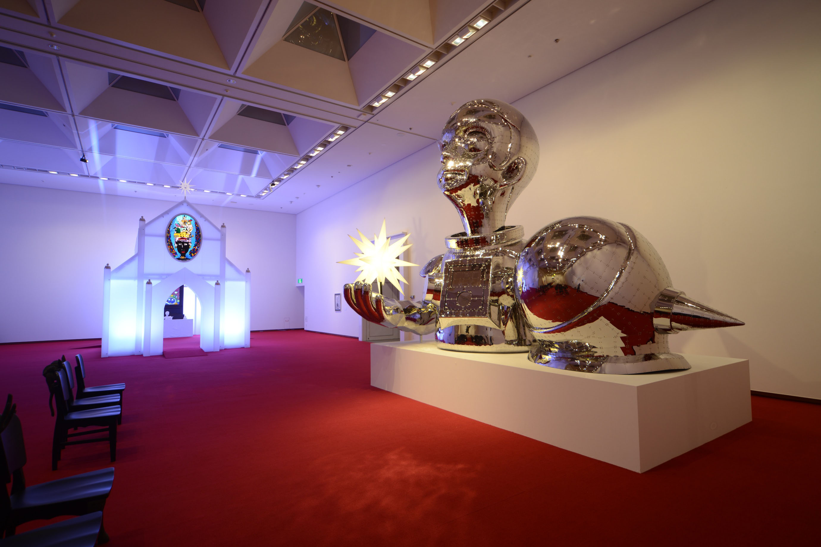 Two massive installations cap the ends of the main exhibition as prospective frames of reference: Shinjiro Okamoto's "Rolling Cherry Blossoms: The Big Bomb for Tokyo" (2006) and Katsuhiro Miyamoto's "The Fukushima No. 1 Nuclear Power Plant Shrine" (2012).