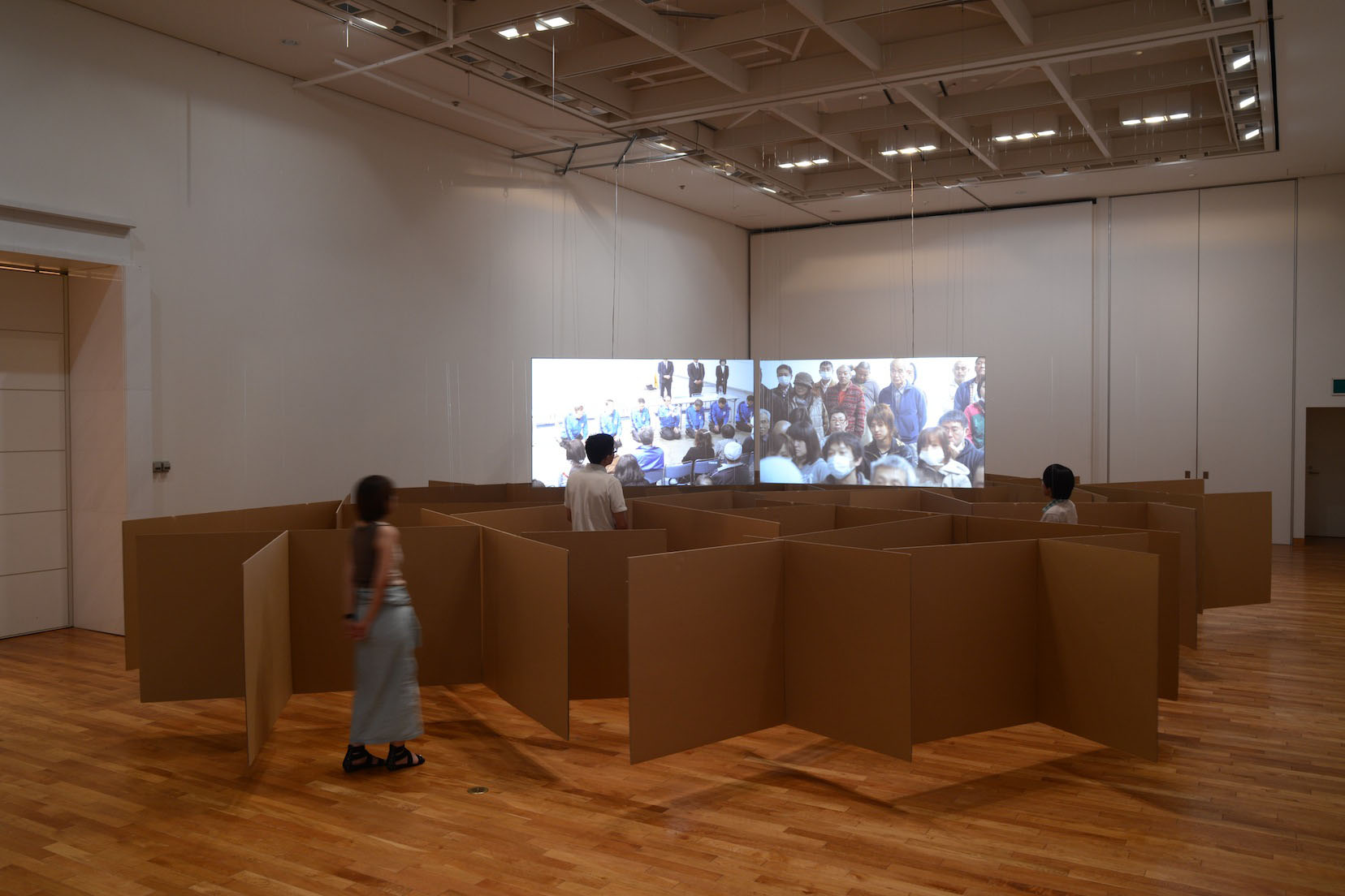 Dutch artist Aernout Mik's "Cardboard Walls" (2013) is a video installation with a different point of view in that it focuses specifically on disaster evacuees through a theatrical reconstruction of actual events. Scenes are projected onto white monitors and show a generic reconstruction of the Big Palette Fukushima conference building, which served as a disaster-refugee center, and highlights the hardships of evacuation. The refugees are housed within cardboard cubicles that only contain whatever possessions they were able to grab when they fled. The small shelters don't have roofs or privacy. Blue-jacketed Tepco employees move through the crowded cardboard slum bowing and getting on their hands and knees in order to apologize. One old man gestures for them to get out, waving his finger as he scolds them. The blue-coated delegation then move off and find someone new to apologize to. At one point, the Tepco employees go to sleep in one of the cardboard enclosures and this allows the viewer to vicariously live the life of the victim through the victimizer. This is done through the surrounding projection screens. However, the viewer — and the Tepco official — gets to move on from this situation. Their duties are done, their inaudible apologies delivered and the scenes are silent. It is pathetic, painful and moving.