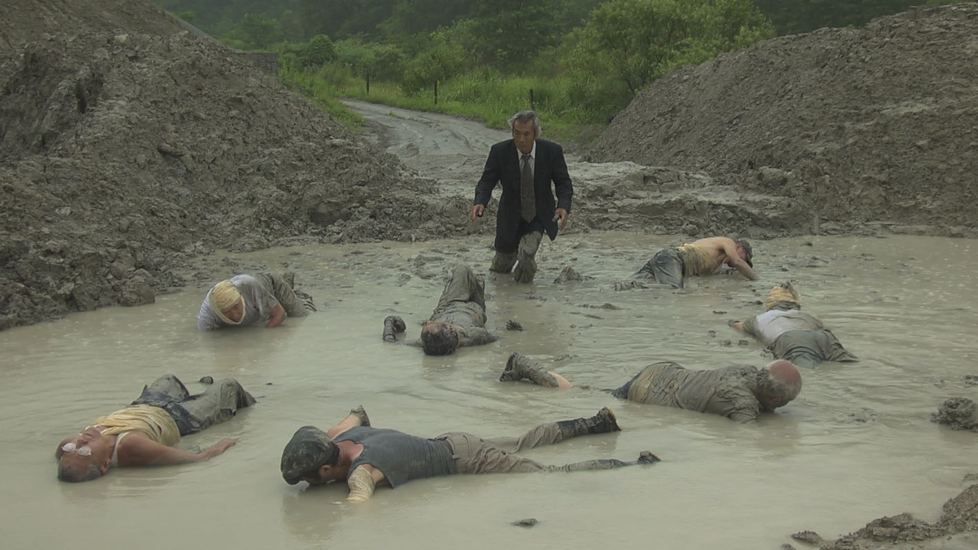 In contrast to the hero and his elderly fellow travelers, straining against the pull of age, gravity and the Earth itself (in one sequence they sink into the gray mud and murky water of what looks to be a gravel pit), a youngish woman (Shiho Ishihara) suddenly appears as an obscure object of desire, an embodiment of the life force in a flower-print dress. Yet she too partakes of the universal struggle, screaming and writhing in labor on the floor of a ruined building as the old men stare indifferently and slump impotently.