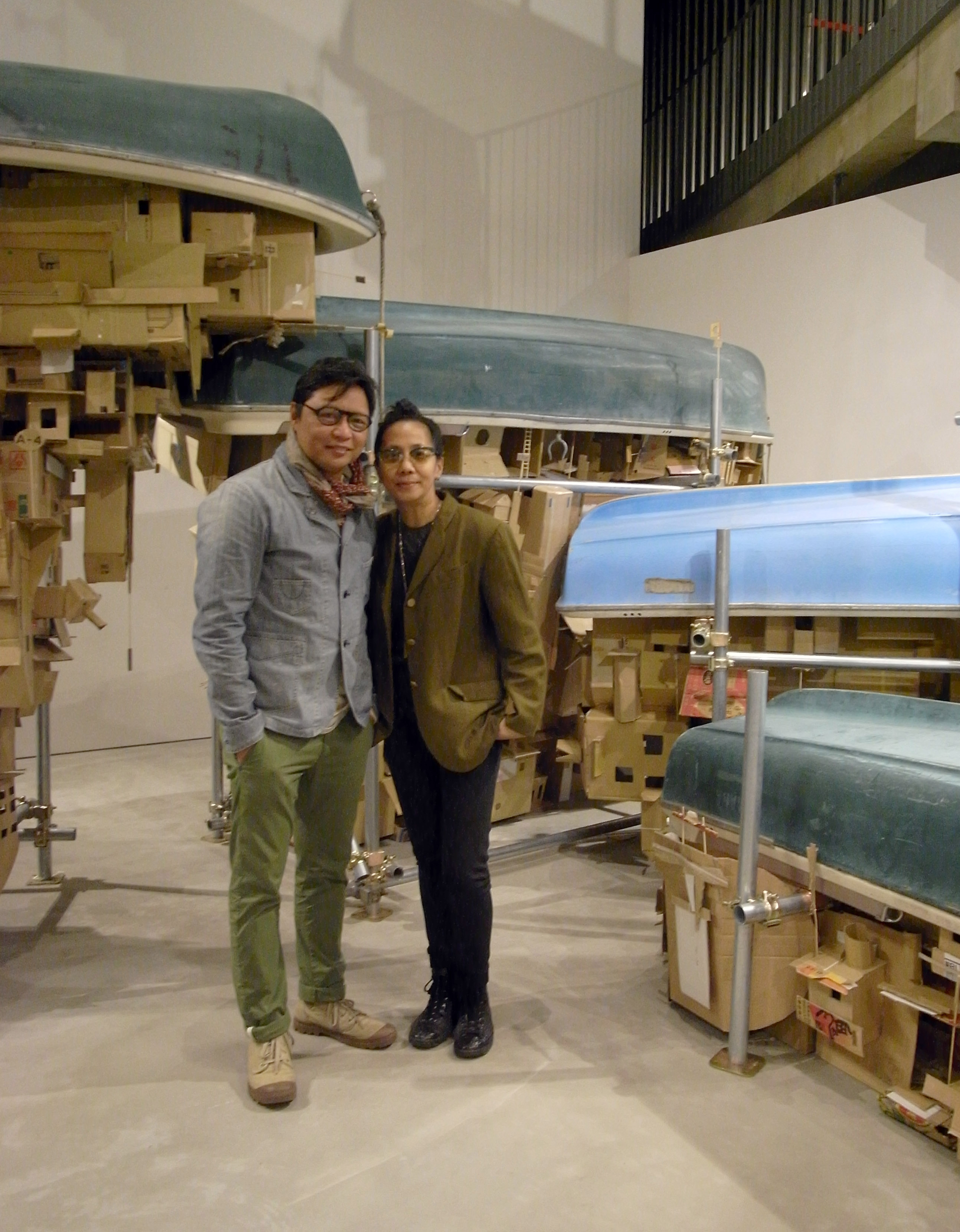 The meandering Yoro River stretches throughout this region. Contemporary artists Isabel and Alfredo Aquilizan felt this winding river, "was a sign of the changing landscape," becoming a vehicle for them to engage with migration and settlement in Ichihara. During a visit last fall they began working with residents to make miniature houses out of cardboard boxes, which they then positioned under small boats that can be found in Takataki Lake nearby. Isabel explains why they chose these colorful boats: "When the first settler arrived at an island they inverted a boat, that became the first roof and the dawn of architecture." The two artists' focus on mobility is both personal and political, as their own story of migration from the Philippines to Australia is linked to the ambulatory realities of others across the globe today.