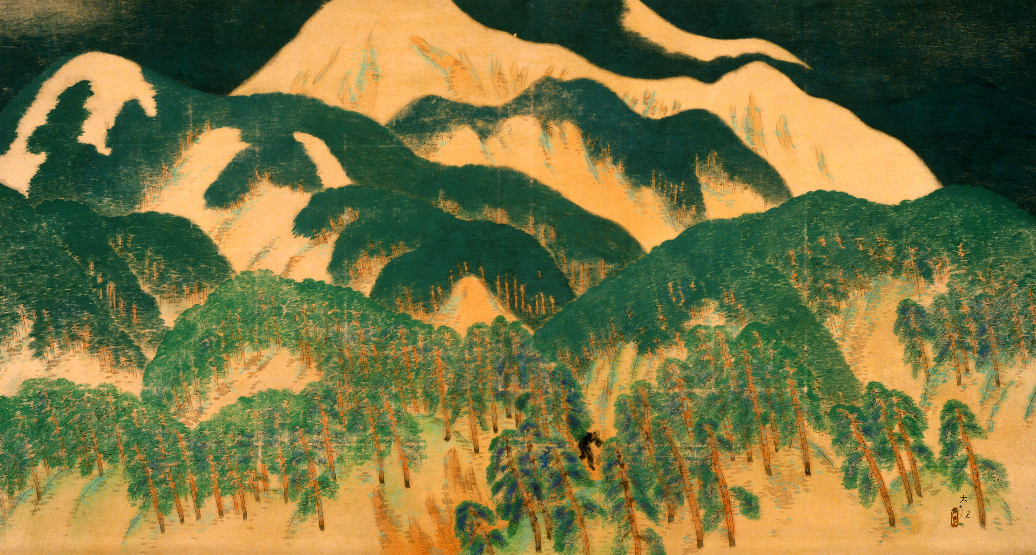 Taikan Yokoyama (1868-1958), for example, experimented with gold and silver as a means to add light. In "Mt. Kisen" (1919), he applied gold leaf to the back of Japanese paper so that a faint glimmer of the gold would show through the weave, imparting a soft and gentle light to the mountain scene on the front. In "Bamboo," painted the same year, he applied gold leaf to the entire underside of silk and painted a scene of bamboo in ink on the front. What would have been a monochrome work in shades of gray, black and white is transformed into a luminous, highly atmospheric scene that might be a bamboo forest in early morning light or after a rain.