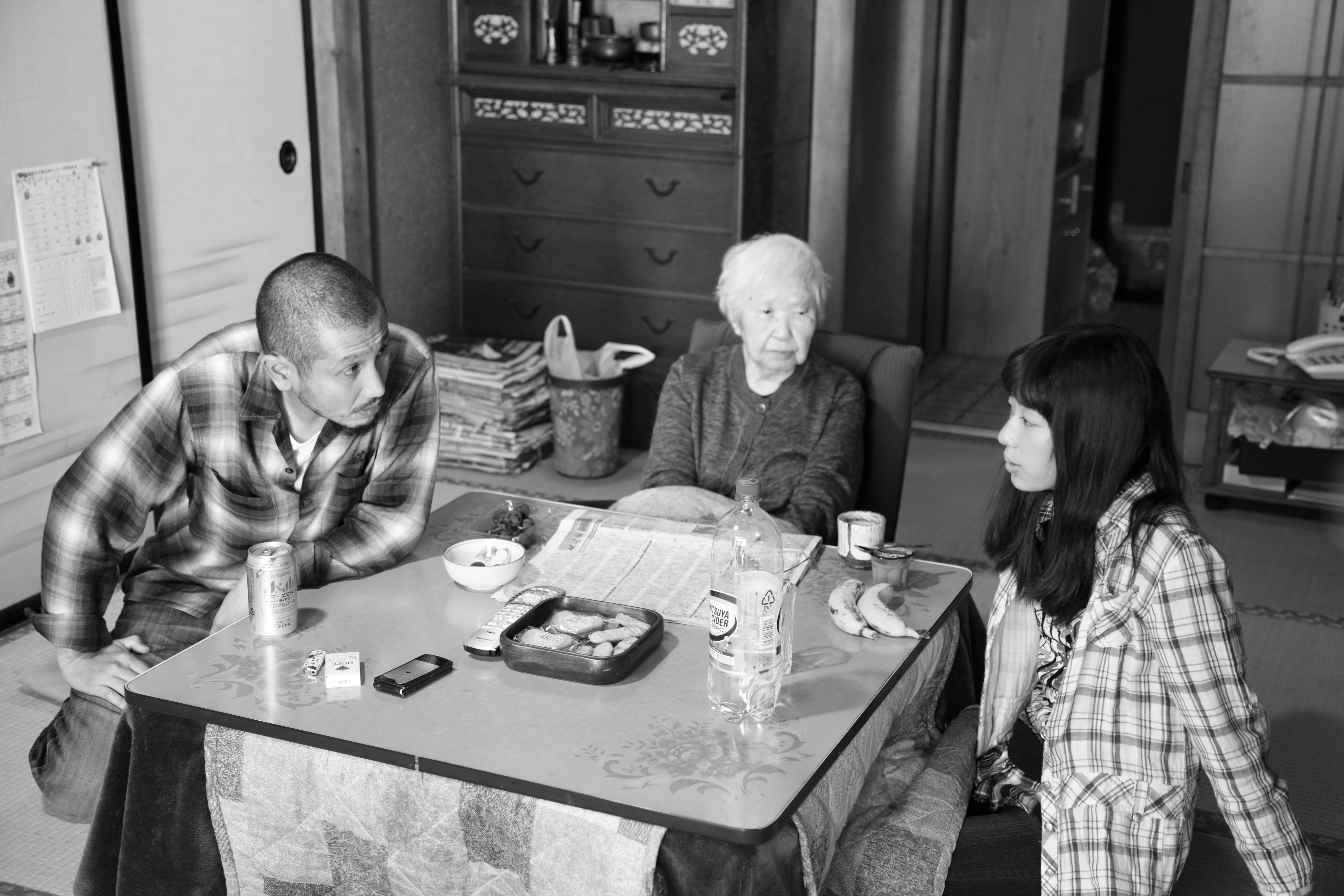 So why doesn't Takashi, wearing his pork pie hat and flannel shirt, get out? Living with his half-dotty granny (played by the director's own 96-year-old grandmother), he spends his days napping under the kotatsu (heated table) — from which we first see him rising like a zombie — playing pachinko and hanging out with his lantern-jawed, similarly unemployed pal, Shohei (Kaoru Iida).