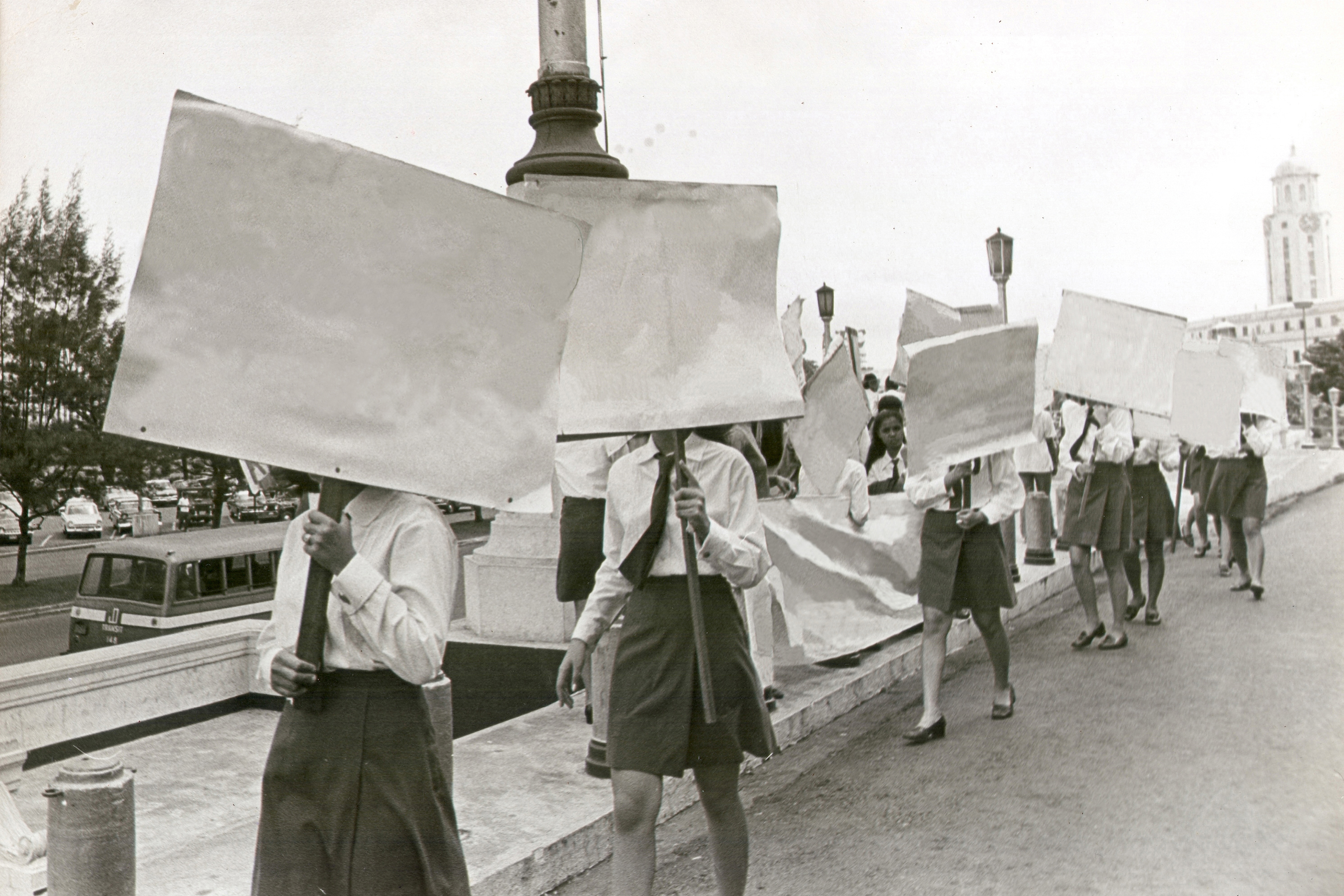 At one level these works are a general appeal to a sense of shared humanity, despite the exhibition's overall goal of unravelling us as subjects. Pratchaya Phinthong's "Give More Than You Take," a work that combines video of Thai seasonal workers berry picking in Sweden with an installation of material equivalent in weight to the berries collected, and "Monologue," a search for the final resting place of a loved one killed by the Khmer Rouge, also derive a lot of their power from operating in this way. Other pieces are more immediately political, such as Kiri Dalena's retouched images of postwar Philippines protests, in which slogans on the banners have been erased, and Saleh Husein's monotone paintings of the Arab-Indonesian nationalist movement.