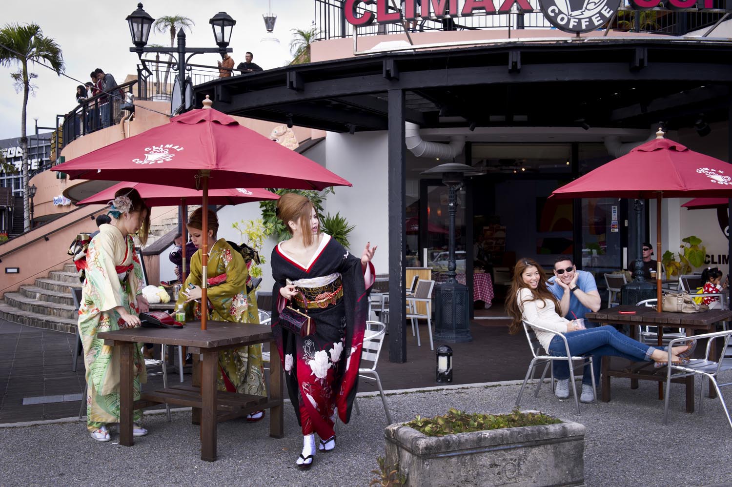 Hatsuzawa's photos often include multiple elements. For example, in a photo taken at a cafe in Chatan, three young women are dressed in boldly designed kimono for a coming-of-age ceremony. They are standing by a table under a red parasol, while a smiling young woman in jeans with her boyfriend from a U.S. base sit at the next table.