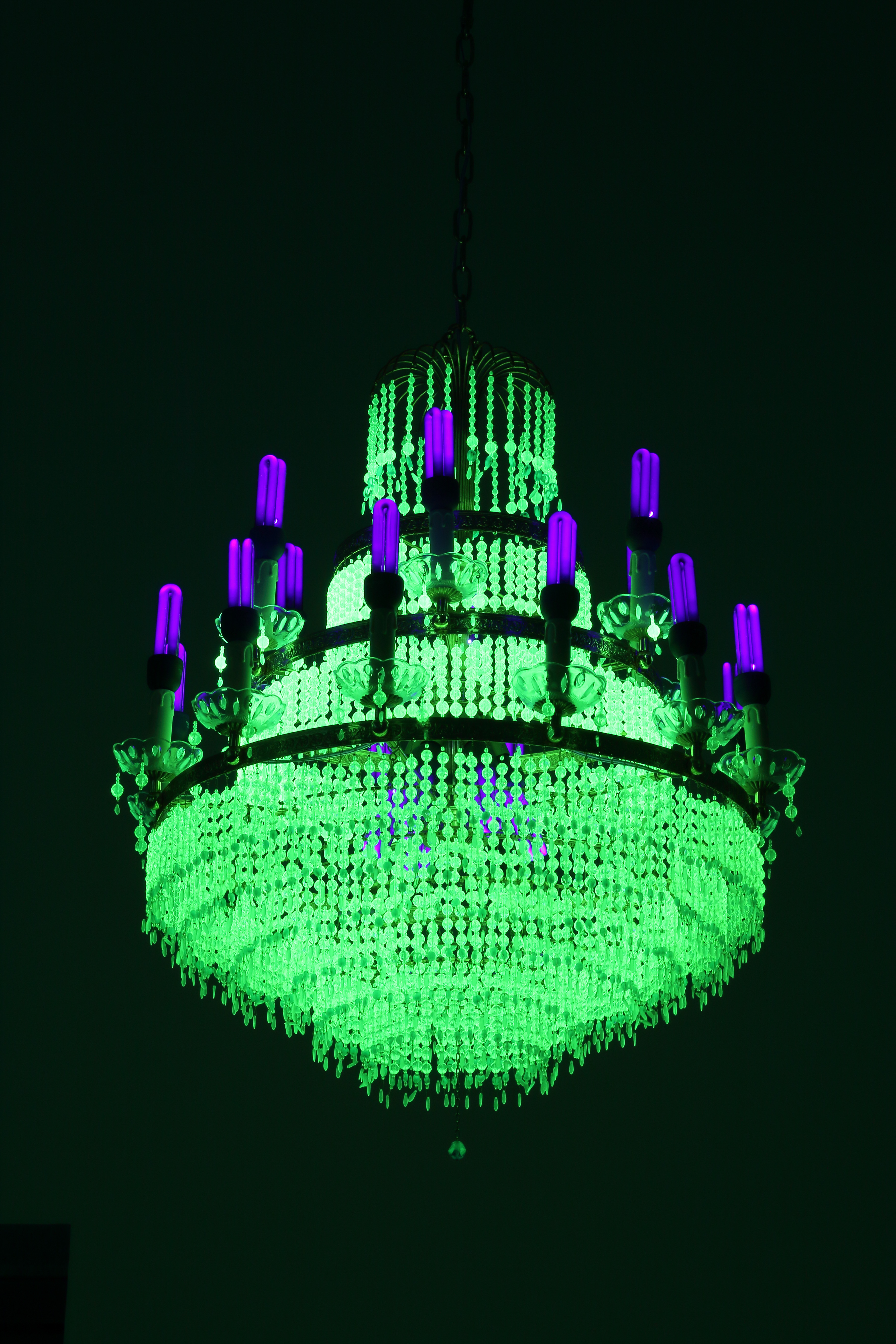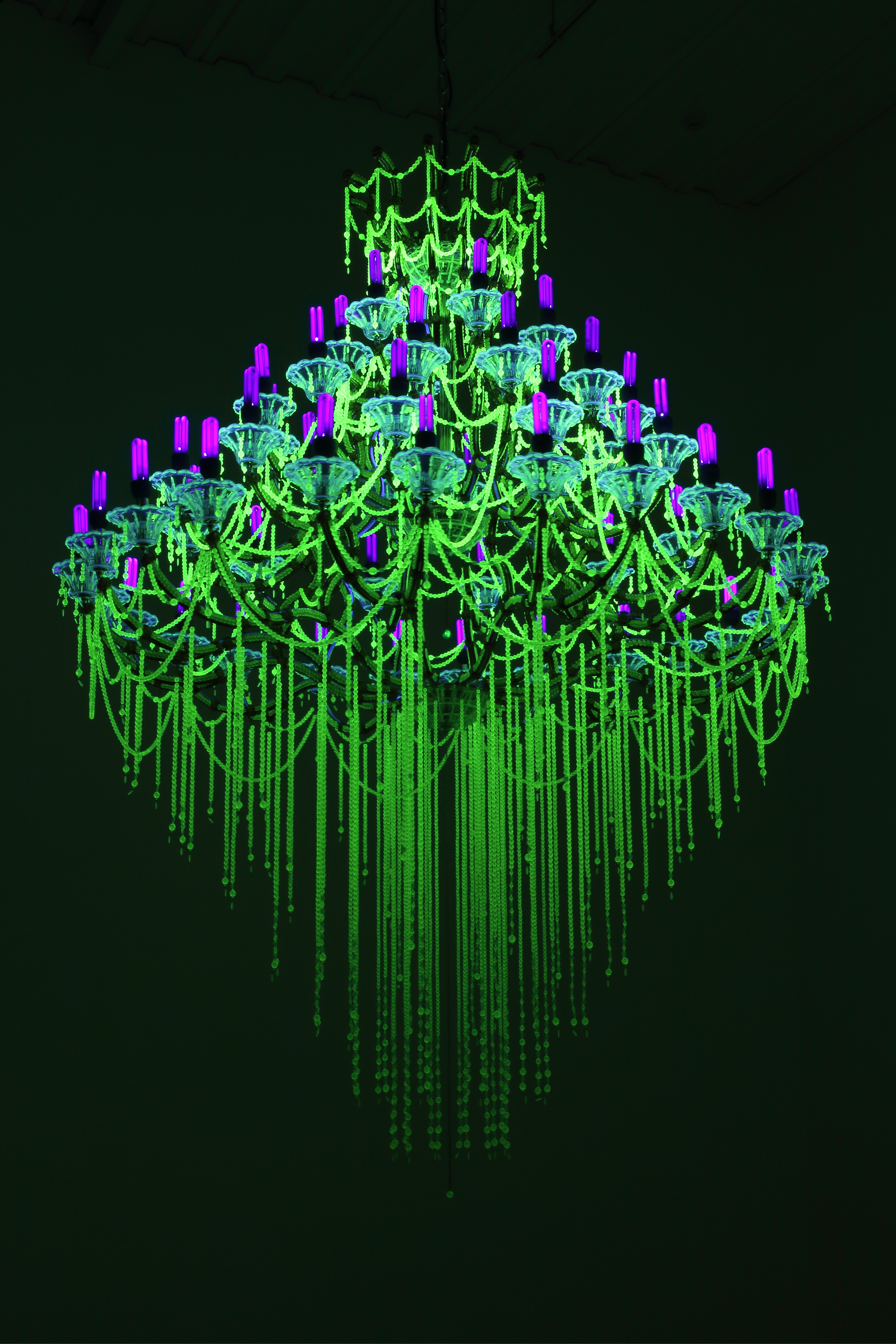 Finding the kind of chandeliers that are often seen in high-end shops in London as an intriguing medium, Ken + Julia Yonetani began putting together "Crystal Palace: The Great Exhibition of the Works of Industry of all Nuclear Nations," which debuted at the Singapore Biennale in 2013. The piece's 31 chandeliers represent the 31 countries that were relying on nuclear power at the time of the Fukushima No. 1 power plant disaster, with the size of each chandelier corresponding to the number of operating nuclear plants in that country. Refitted with uranium glass beads, the light fittings glow when lit by ultra-violet light.