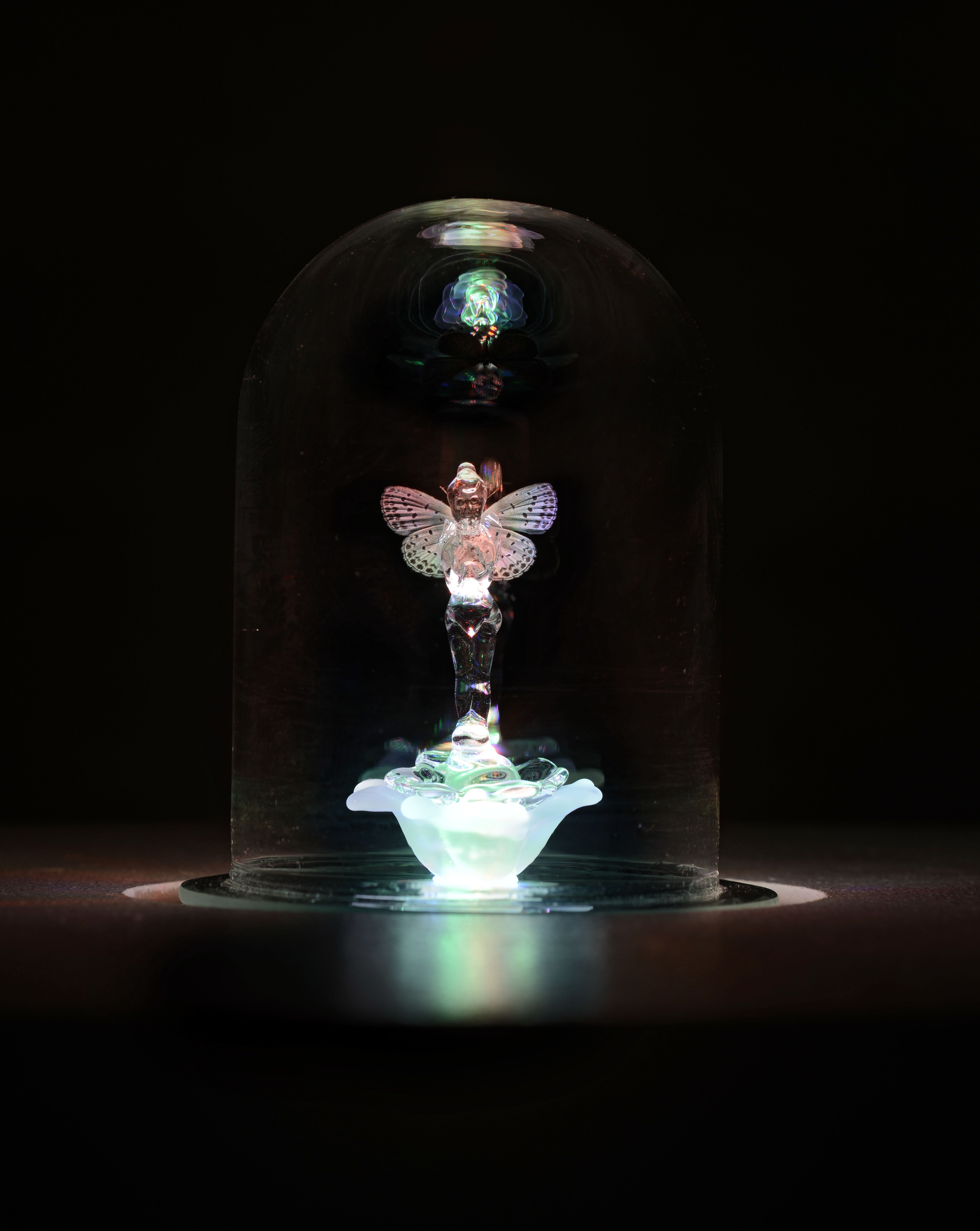 Other works in the show include a newer piece titled "Three Wishes." This features three rotating glass figurines modeled after Disney's Tinkerbell. The fairy's wings, however, have been replaced by real Zizeeria macha butterflies, which were collected as a part of a lab study on the biological impact of the nuclear disaster.