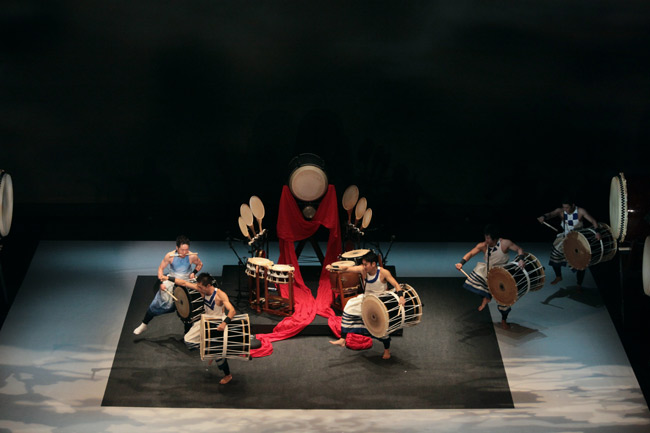 It's the image that comes to most people when they think of a traditional taiko (Japanese drum) performance: A man standing in front of a giant drum, back to the crowd and furiously banging away to create a powerful rhythm.