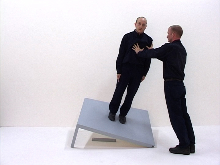 The exhibition as a whole is full of visual tricks and experiments that might have been devised by a genius toddler who has just read Isaac Newton's "Mathematical Principles of Natural Philosophy" and is testing out the laws of motion and gravity using materials at hand without being greatly concerned about clearing up the ensuing mess. When Wood and Harrison perform in videos they use their bodies as hapless objects, purposefully poker-faced as they fall, push each other and bounce around in setups that exploit the classic comedy pairing of short and tubby with tall and thin.