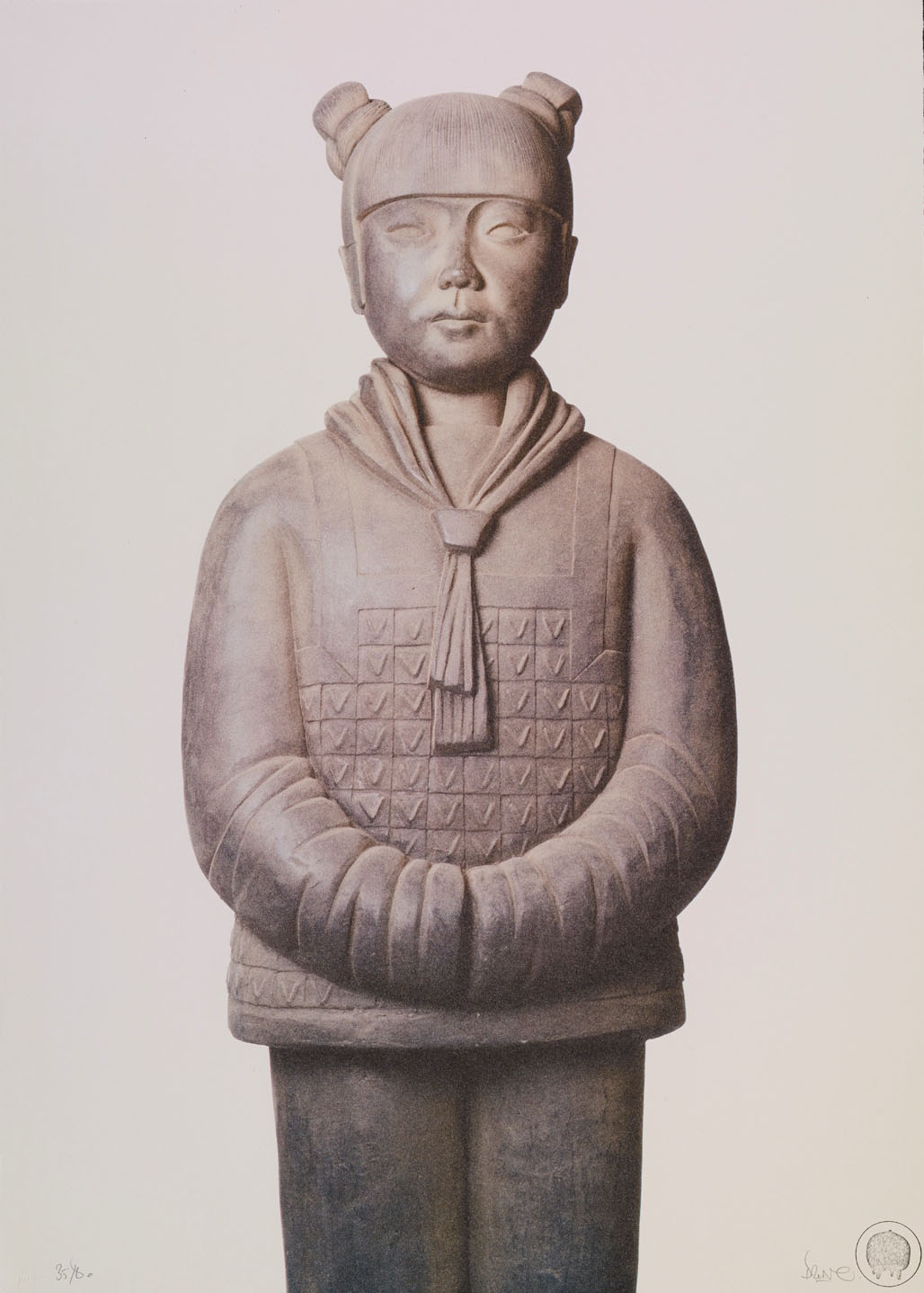 Okabe Masao's prints are black frottages from the floor of the Idem workshop, offset with small bars of deep crimson; Prune Nourry's photographic lithographs are a typology of monotone teenage Terracotta Red Guards. Tatsuno Toeko's images are abstract geometric shapes and patterns that show off the richness of color and graphic precision of lithography, as do prints by Lee Ufan of single oversize brushstrokes and Xavier Veilhan's polygonal bodies. Though all the work is from the 21st century, the feel is more classic modern, that is to say, cool, cerebral and authoritative.