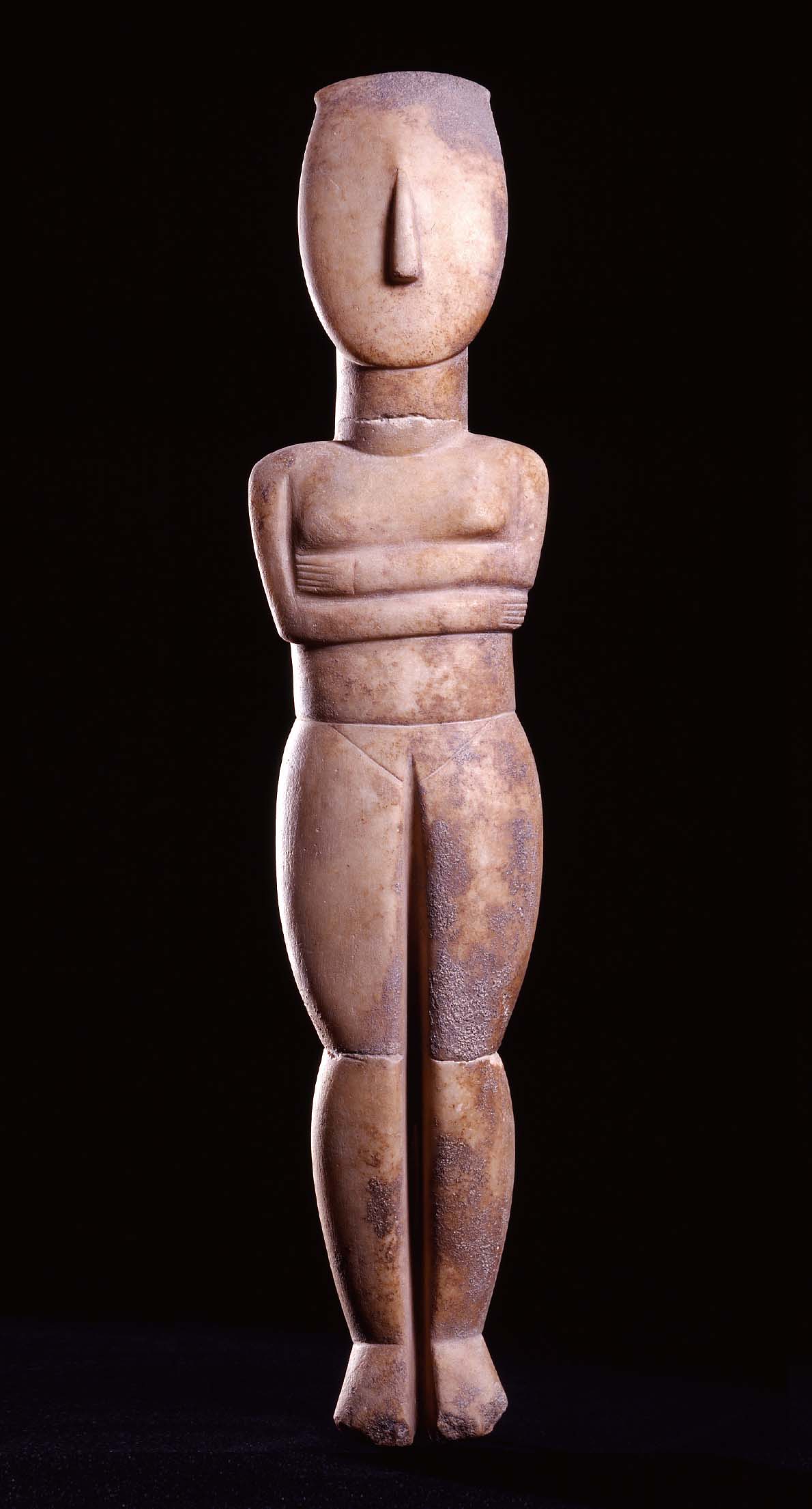 The stone figures dated to the 3rd millennium BC from the Cyclades islands in the Aegean Sea come as a shock, showing minimalist, alien-looking forms, and the exhibition attempts to link these to the kore (maiden) and kouros (male youth) statues from the 6th century BC. These rather stiff statues of male and female youths are generally regarded as the starting point of Greek classical sculpture.