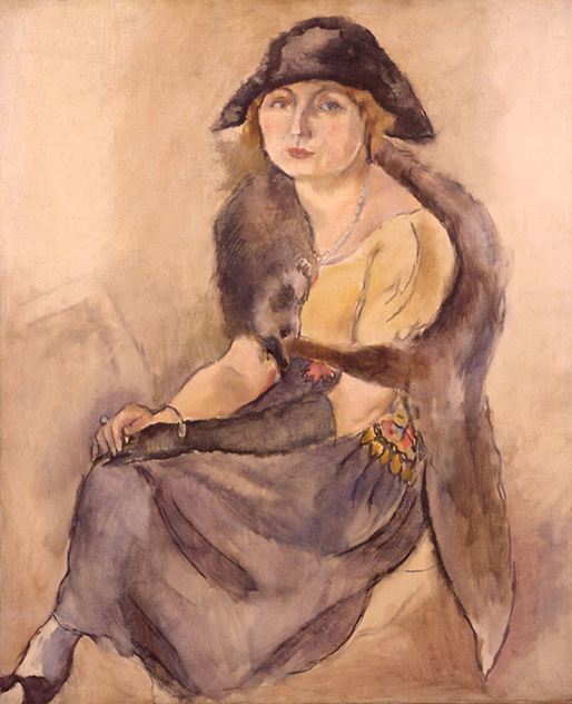 One of the exhibits in this section is Jules Pascin's "Princess Ghika," a 1921 painting of erstwhile courtesan, Folies-Bergere dancer, writer of lesbian fiction and wife of a Romanian prince Liane de Pougy. De Pougy is depicted wearing a floppy bicorne hat, a style made popular through silent-era swashbuckling movies, a fox stole, and a loose-fitting off-the-shoulder yellow blouse with a blue-black skirt cinched by a colorful patterned brooch. Next to the painting we can see a close replication of this outfit — complete with a real fox stole and a brooch of the same pattern.