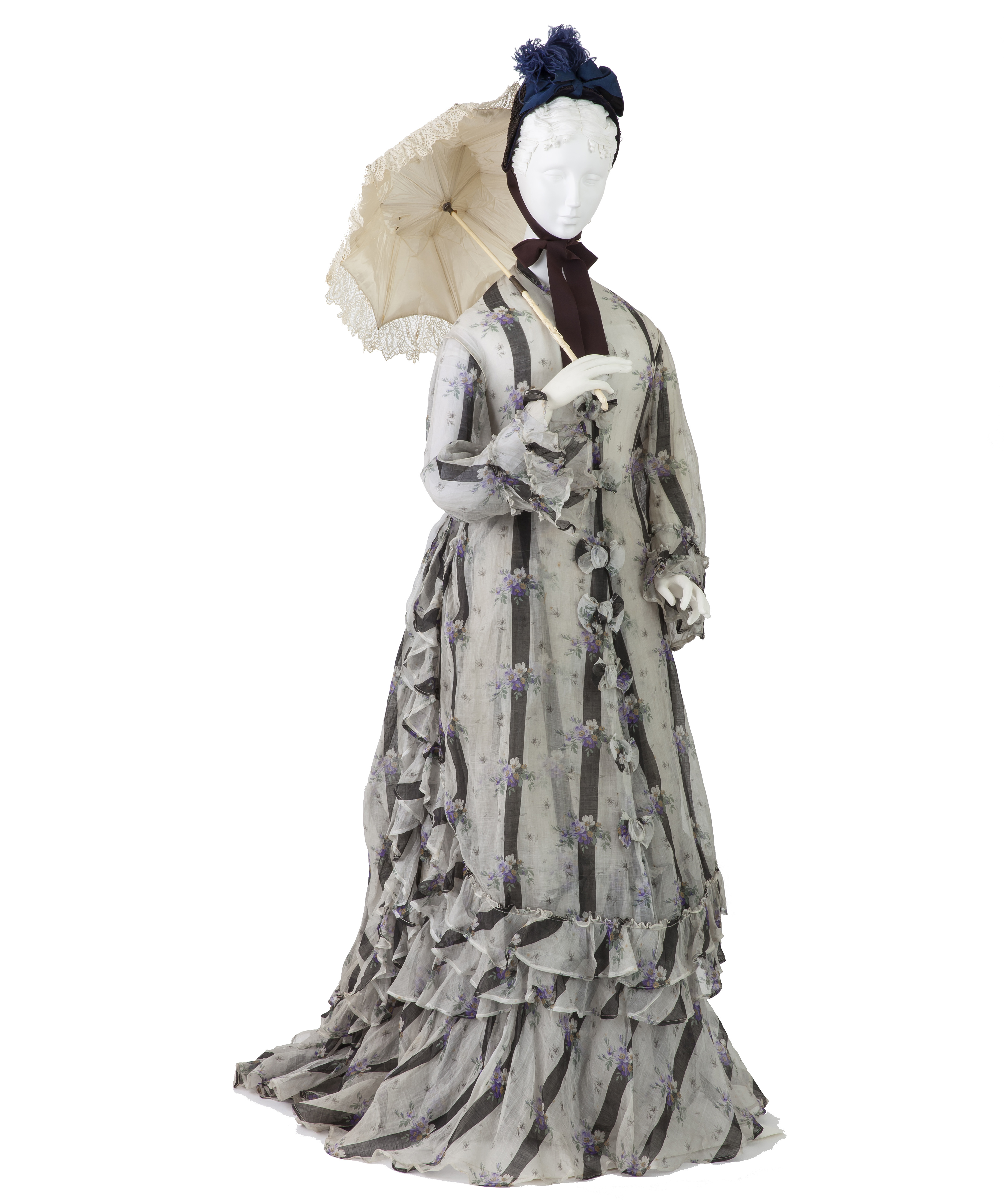 The exhibition provides a pristine example of a dark brown American silk and satin afternoon dress dated 1883. The dress is from the "second bustle era," after the pronounced posterior had once gone out of fashion only to be brought back, courtesy of the House of Worth, for one last voluminous hurrah. The bustle was finally extinguished by criticism of the uncomfortable posture, lampooned at that time as the "Grecian bend," and followed by the advance of the more relaxed "aesthetic" dress, championed by fin de siecle artists and intellectuals such as Oscar Wilde.