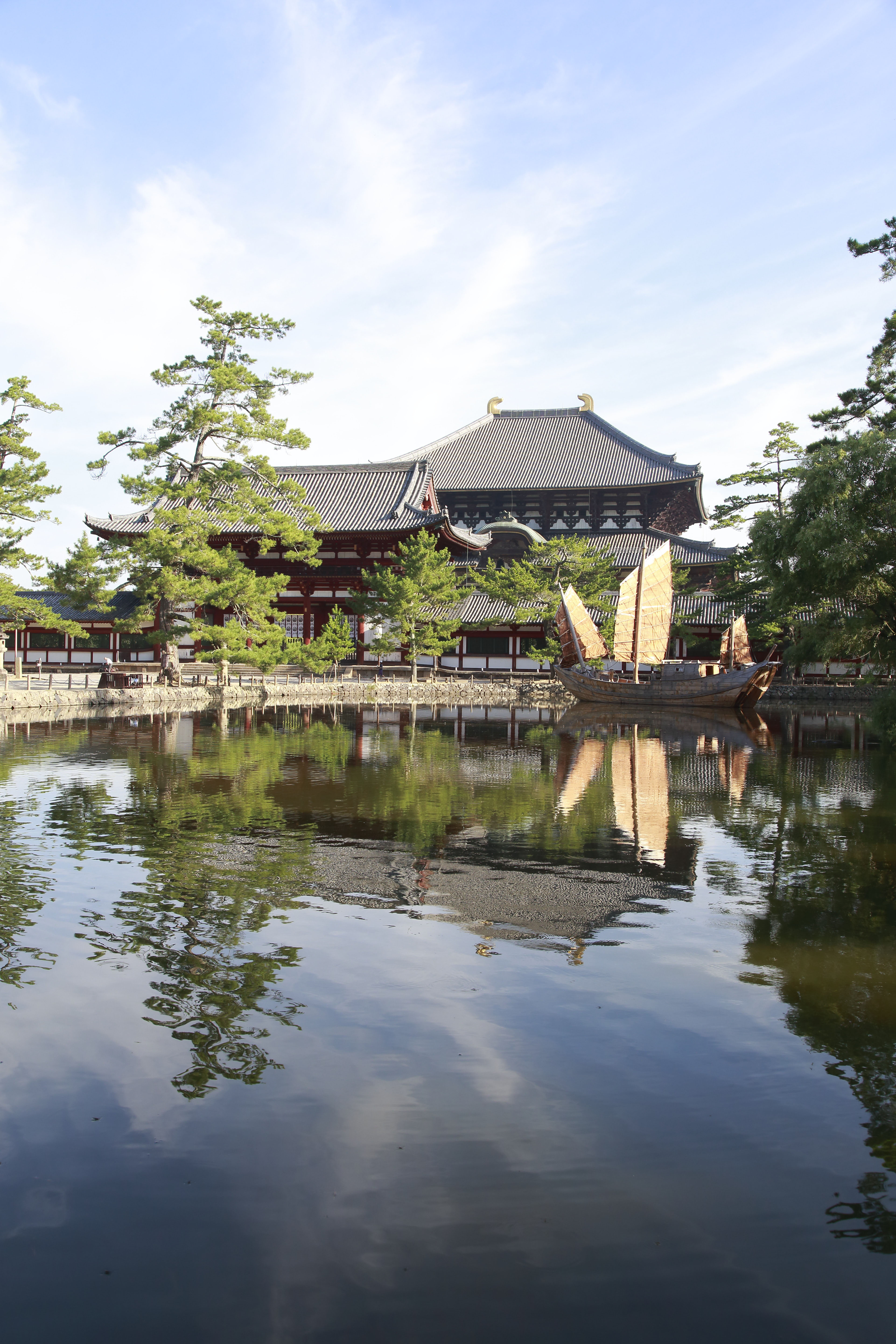 Todaiji Temple has quite a history. It is well known for its Birushana Daibutsu (Great Buddha) statue, a national treasure that was originally built in the mid-8th century as a prayer monument to peace and prosperity. It was a symbol of the power of Buddhism and its stabilizing influence on the nation as it was being formed by the adoption of Chinese culture during the Nara Period (710-794). As the capital of Japan at that time, Nara was being modeled after the Chinese city of Chang'an (present-day Xian). "To Build a Ship," the work of Cai, an international Chinese artist based in New York, is currently being exhibited in Todaiji's Kagami-ike pond, which the artist explains is a metaphor of what he calls the "sea of East Asia."