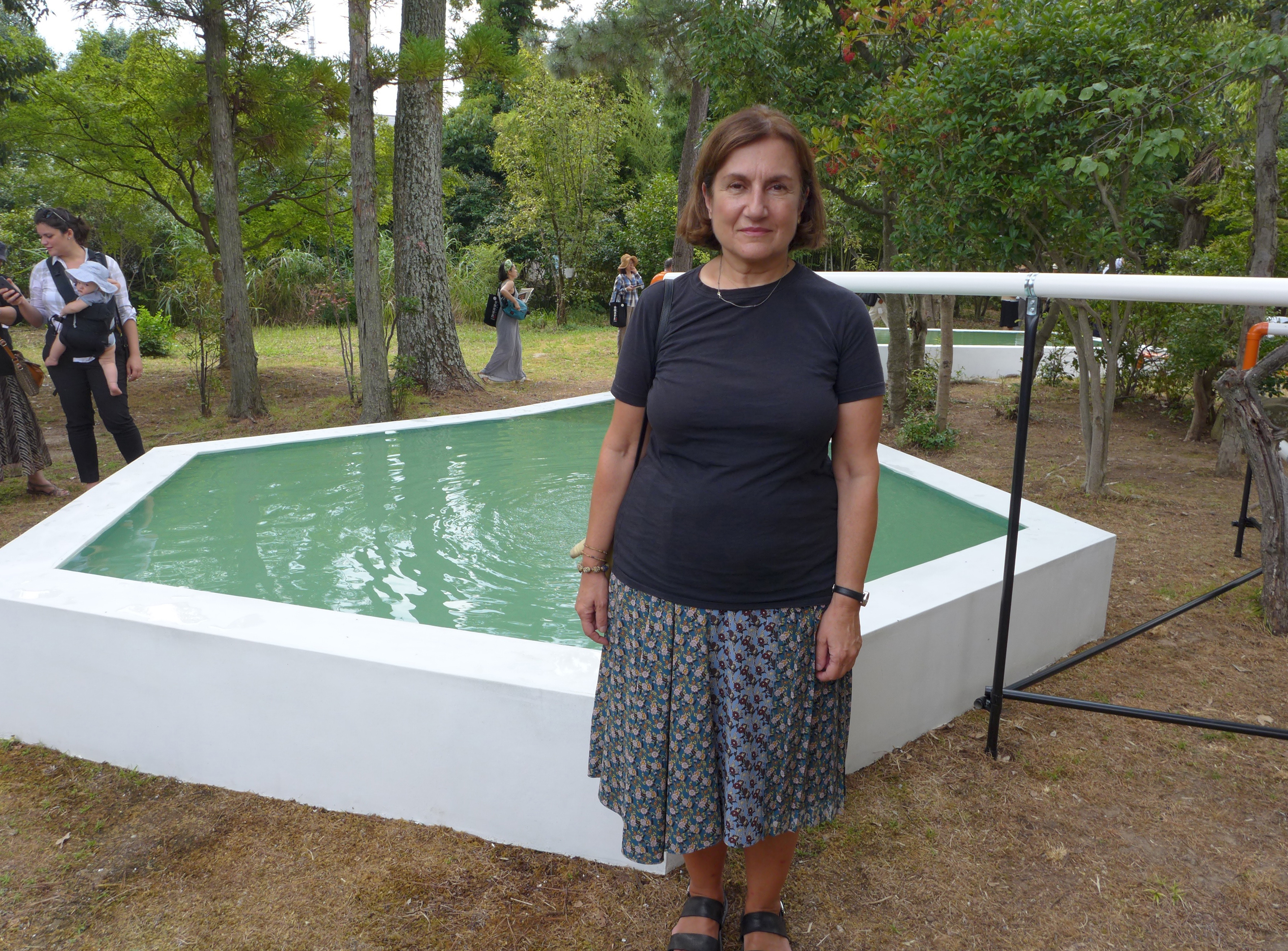 "The weedy site in the west part of the Saidaiji Temple had an atmosphere of forgotten ruins. There is a stagnant pond in front of a teahouse, the area in which the west tower once stood during the Nara Period, and I saw that as a symbol of the Eastern end of the silk route," says Erkmen. "I created a Western-style swimming pool next to the pond to symbolize Istanbul, which is where I am from and is the Western edge of the silk route. I connected the (two bodies of water) with pipes that circulate and purify the water to infuse life there. It is an analogy of the union of the West and the East through water circulation."