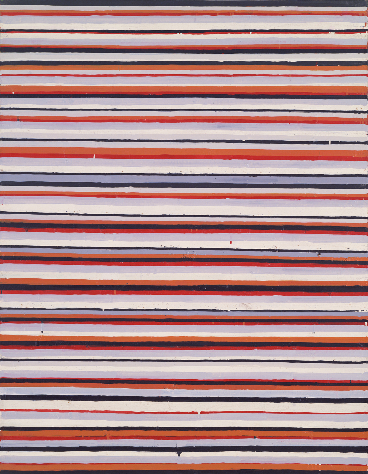 The second began with Willem de Kooning-type painterly abstractions; then he appeared to pay homage to Josef Albers' series, "Homage to the Square" with "Work B.154" (1957-58). His later 1950s paintings are said to foreshadow (though he was entirely unconnected) American 1960s minimalism and artists like Ad Reinhardt (who Yamada met in Tokyo in the 1966), Ellsworth Kelly, and Agnes Martin. The latter is particularly apt because Yamada's paintings of 1959 utilizing repetitious lines led to him become a stripe painter from 1960, the production of which he serialized.