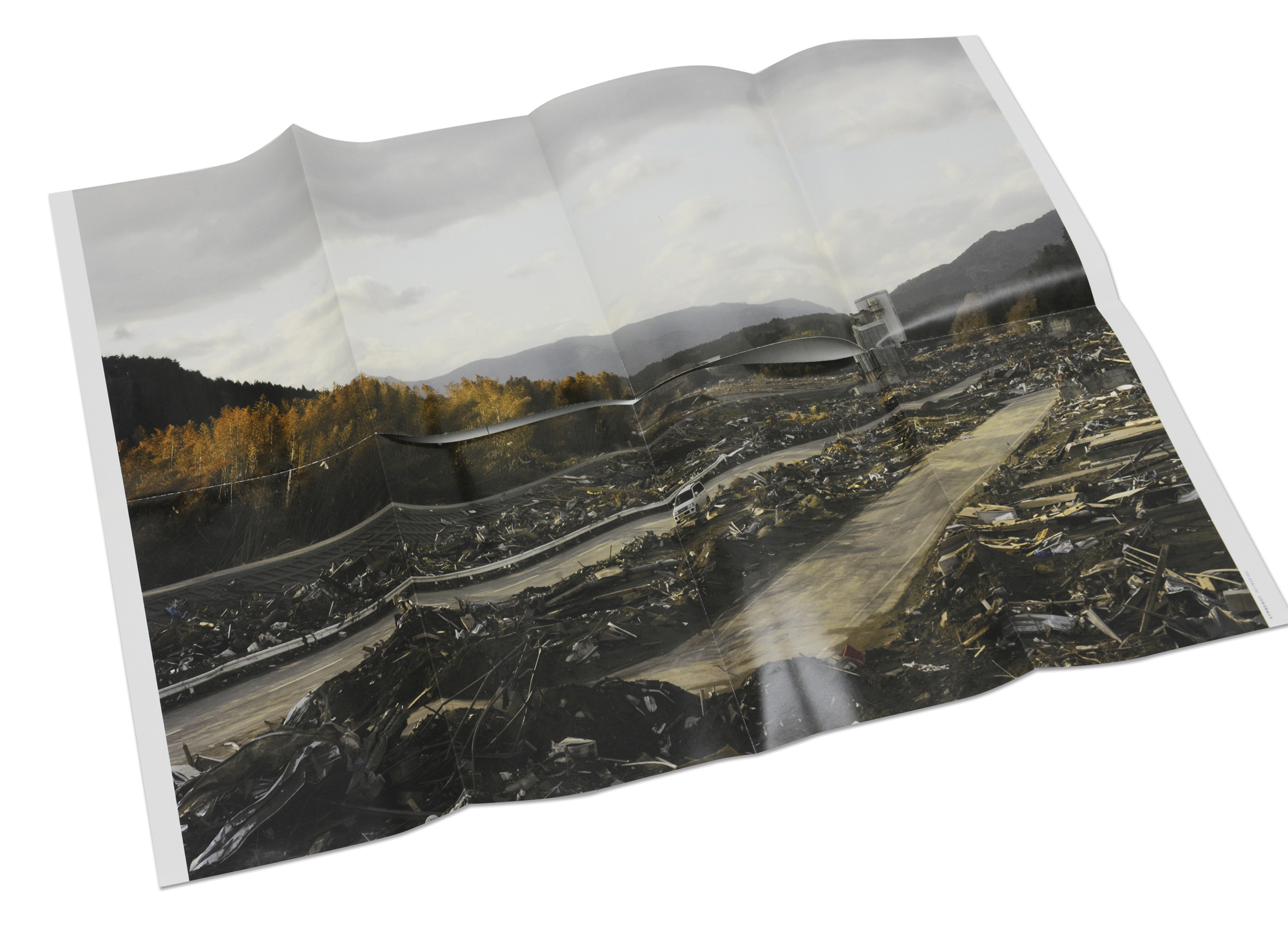 These ephemeral 176 mm × 250 mm pamphlets each fold out to become much larger 500 mm × 707 mm posters in their own right. The meditative images capture sweeping landscapes, dotted with plastic bags filled with contaminated soil or the odd solitary figure in coveralls. We see the ocean, dirt, trees and desolation. Although the effects of radiation on the environment are not immediately apparent, you can find traces of it if you look long enough.